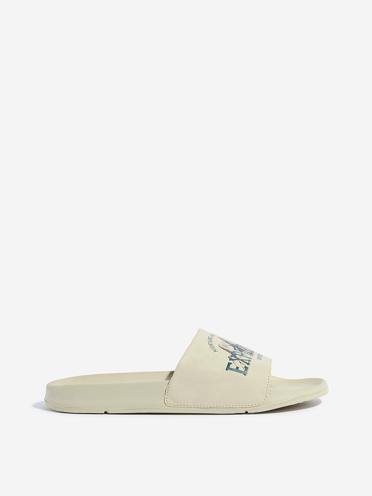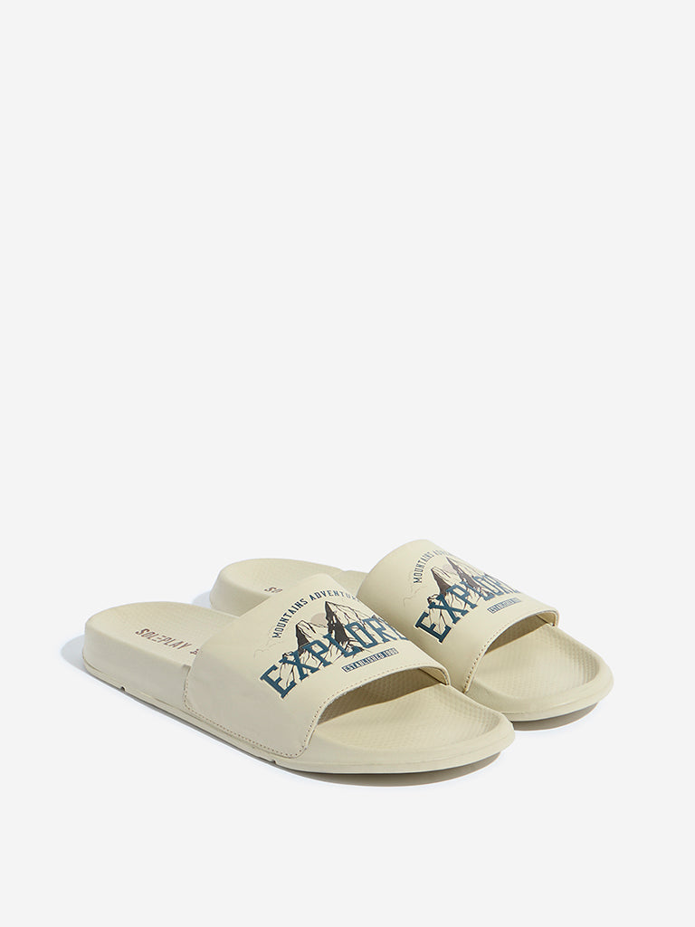 Soleplay presents these beige printed slides. featuring a thick band upper adorned with stylish printed detailing for a bold yet casual look. Designed with a soft insole for comfort and a reliable outsole for traction. these slides offer the perfect combination of style and practicality for everyday wear.