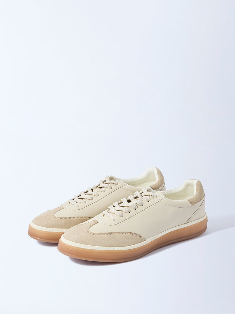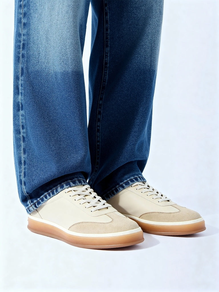 Amp up your sneakers rotation with these beige lace-ups from Soleplay. crafted with a smooth upper and soft suede panels at the toe and heel for a refined contrast. The classic lace-up design ensures a secure fit. while a cushioned footbed keeps you comfortable. Finished with a retro-inspired gum sole. they offer traction and timeless appeal.