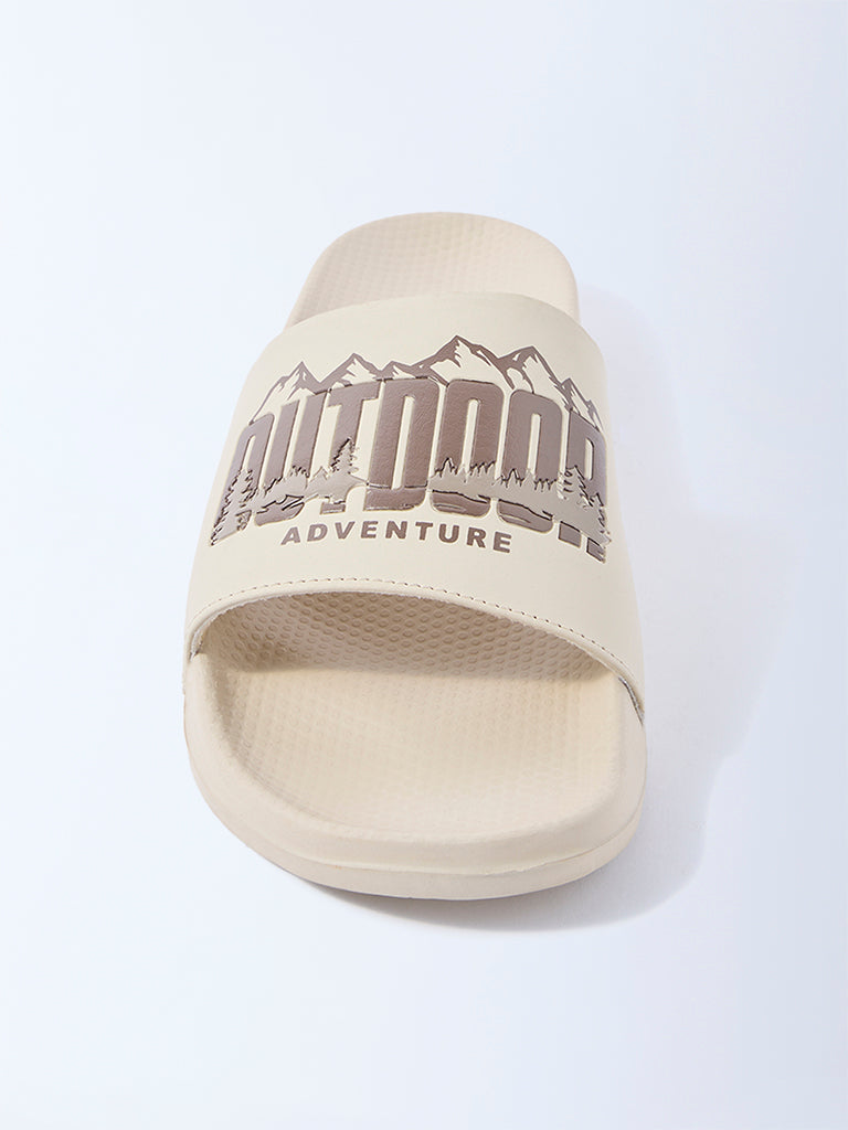 Made for easy days. these beige slides from Soleplay channel an adventurous spirit. Featuring a bold text design across the wide strap. they add character to casual looks. The soft footbed provides comfort through every step. while the textured outsole ensures a steady grip.