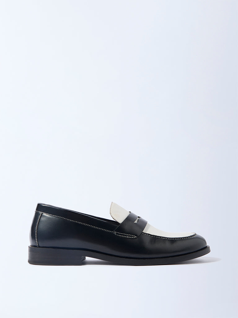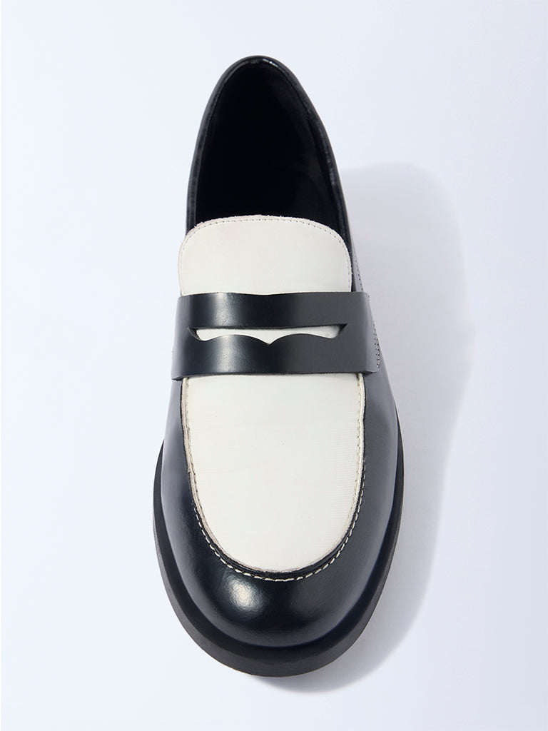 Embrace modern style with a twist of timeless sophistication with these black and white penny loafers by Soleplay. The bold two-tone design turns a classic silhouette into a contemporary statement. while a cushioned footbed ensures all-day comfort. Finished with a textured outsole for stability. these loafers elevate both tailored looks and smart-casual ensembles.