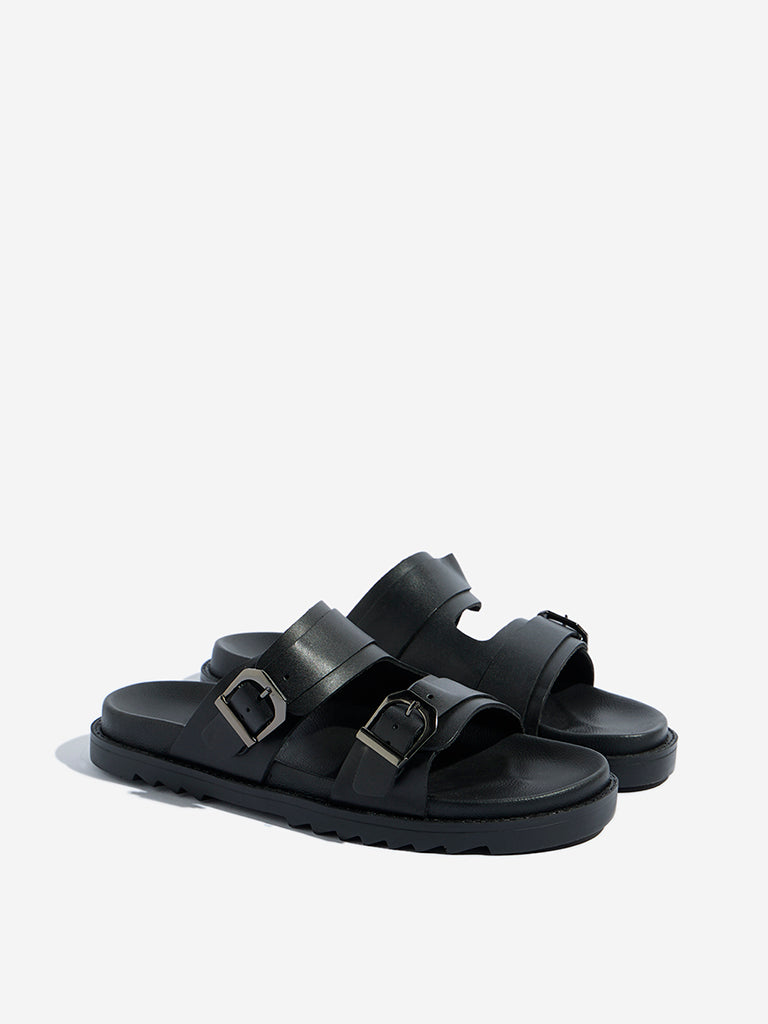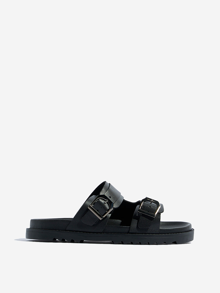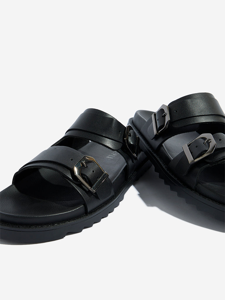 Embrace laid-back style with these black sandals from Soleplay. Designed with two wide straps and metallic buckles. they offer both function and flair. The contoured footbed and slightly elevated sole ensure lasting comfort. while the classic black finish pairs effortlessly with any casual look.