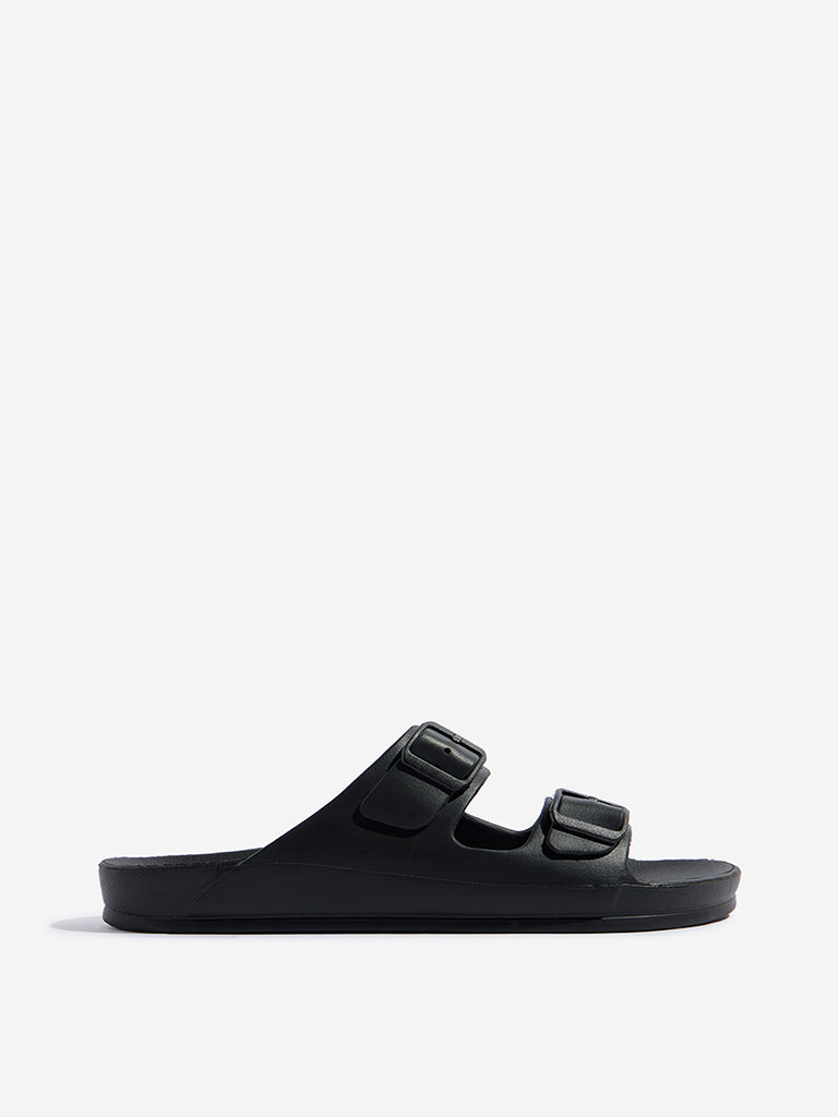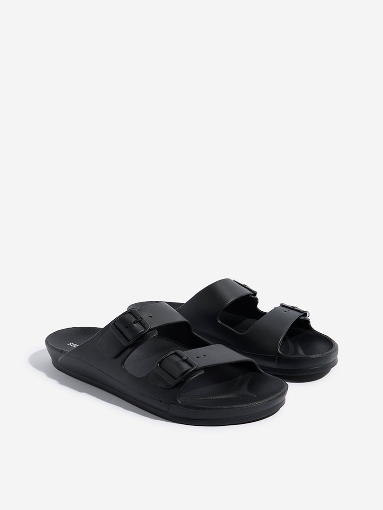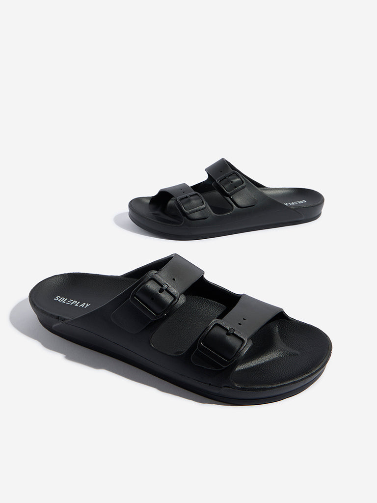 These black sandals from Soleplay are styled with dual buckle straps for a customizable fit. The contoured footbed delivers superior comfort. while the slip-on design ensures easy wear. A textured outsole enhances grip. making them a versatile choice for everyday outings.