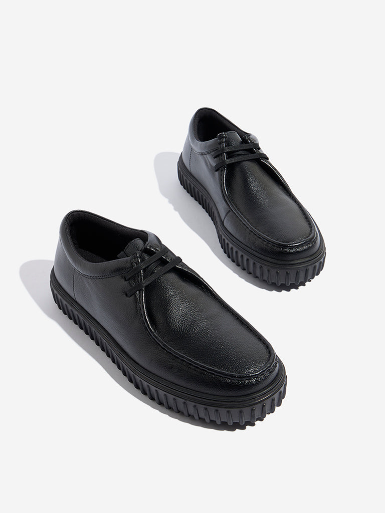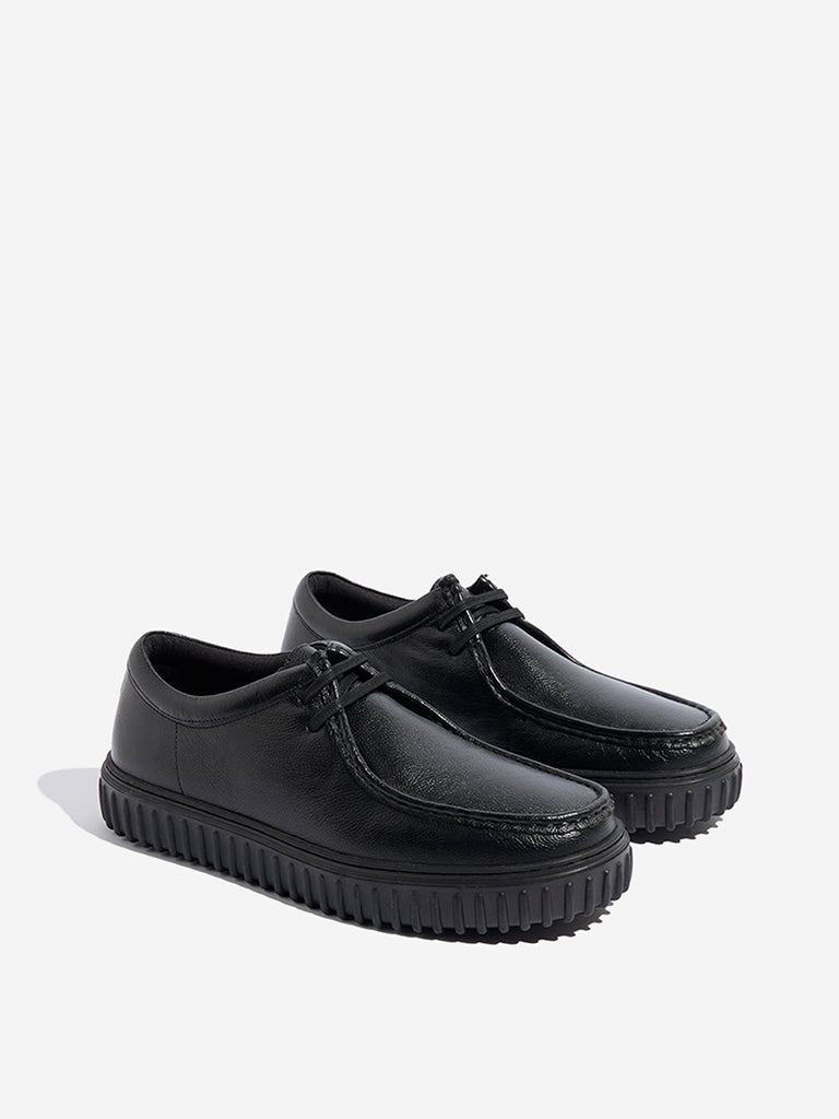 These black shoes from Soleplay boast a sleek upper. complemented by a secure lace-up closure for a refined finish. Designed for all-day ease. they feature a cushioned footbed for superior comfort and a textured outsole for enhanced grip and stability.