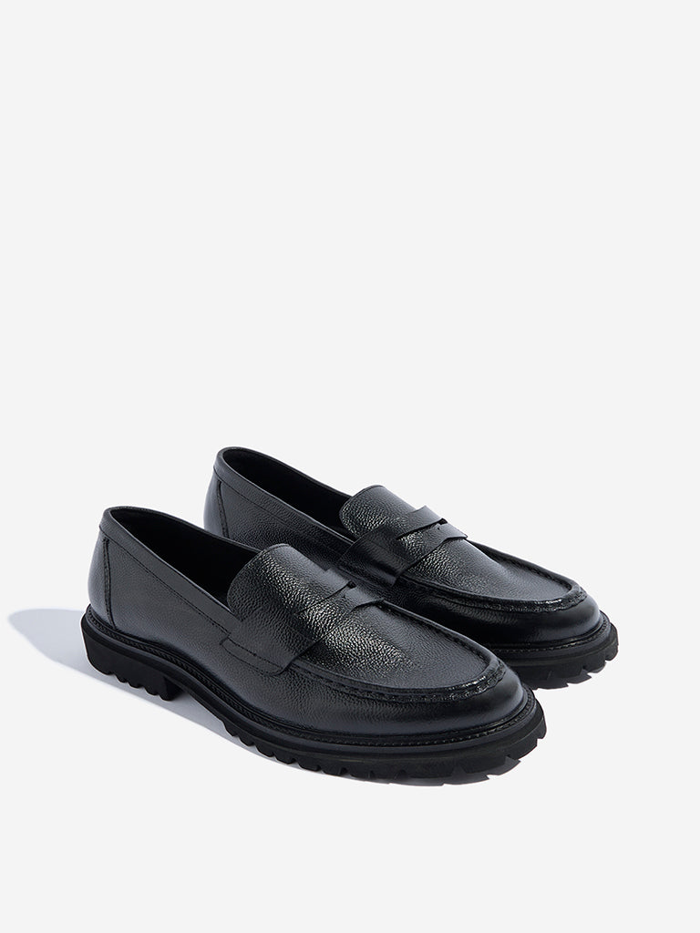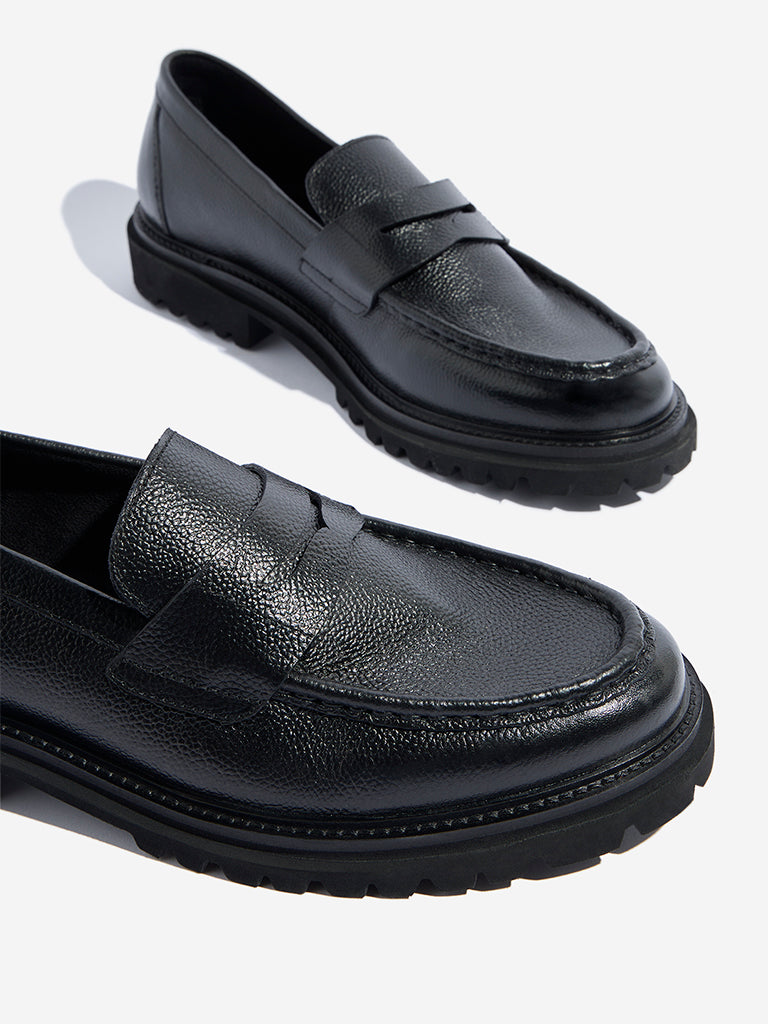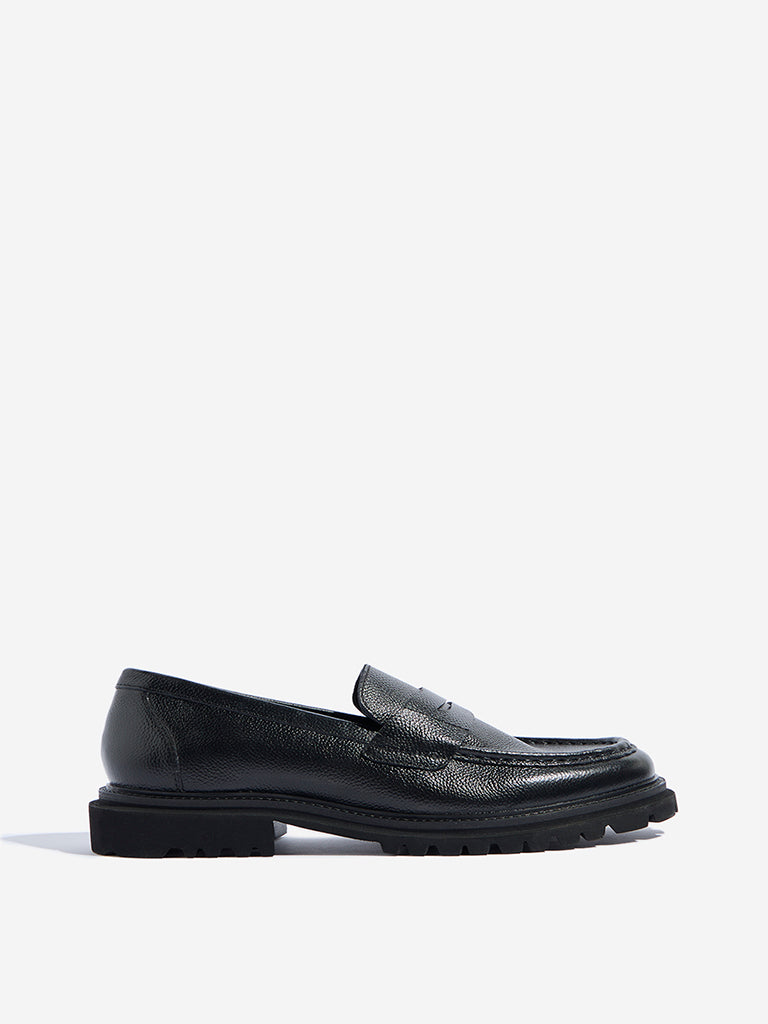 Add a touch of sophistication to your shoe collection with these black penny loafers by Soleplay. Crafted from durable materials. they feature a classic penny strap design and soft insoles for unmatched comfort. The textured. elevated outsole completes the suave look with added practicality.