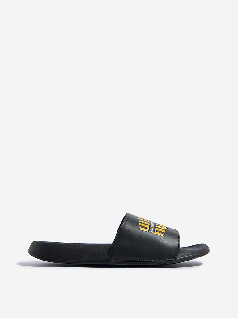 These black pool slides from Soleplay feature a bold text-printed strap for a statement look. The soft. textured insole offers a comfortable feel while the textured outsole ensure a reliable grip for steady movement. They are an easy choice for casual days by the pool or relaxed wear anywhere.