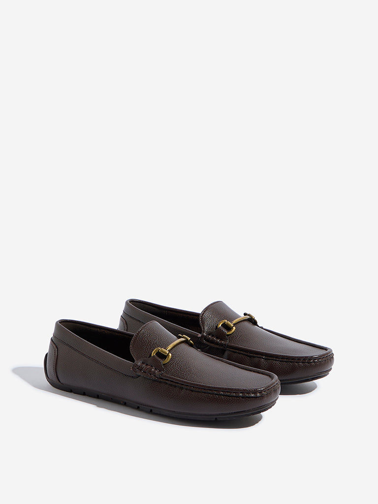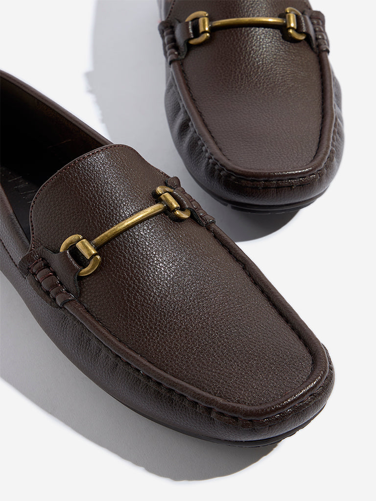 These brown loafers from Soleplay exude sophistication with their textured upper. highlighted by a gold-tone hardware detail across the vamp for a refined finish. Designed for all-day comfort. they feature a cushioned insole for superior support. while the ridged outsole ensures enhanced grip and effortless movement.