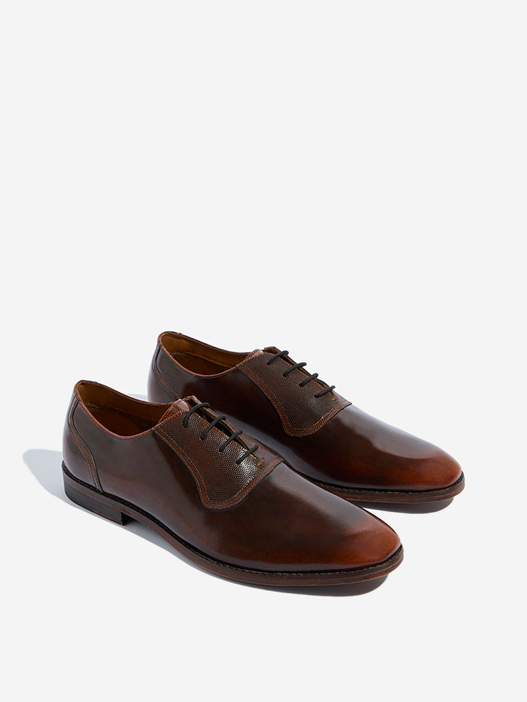 These brown Oxford shoes from Soleplay feature a sleek exterior with a textured panel on the upper for a sophisticated touch. Designed with a lace-up closure for a secure fit. they are finished with a soft insole and a low heel for lasting comfort and elegance.
