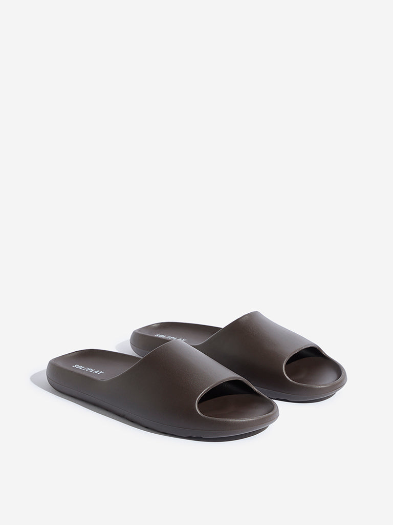 Soleplay brings these brown slides showcasing a minimalist design. They feature a single. wide upper band and a soft footbed for exceptional comfort. The textured sole provides a secure grip. making them ideal for lounging by the pool. running quick errands. or simply relaxing at home.