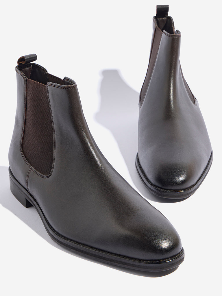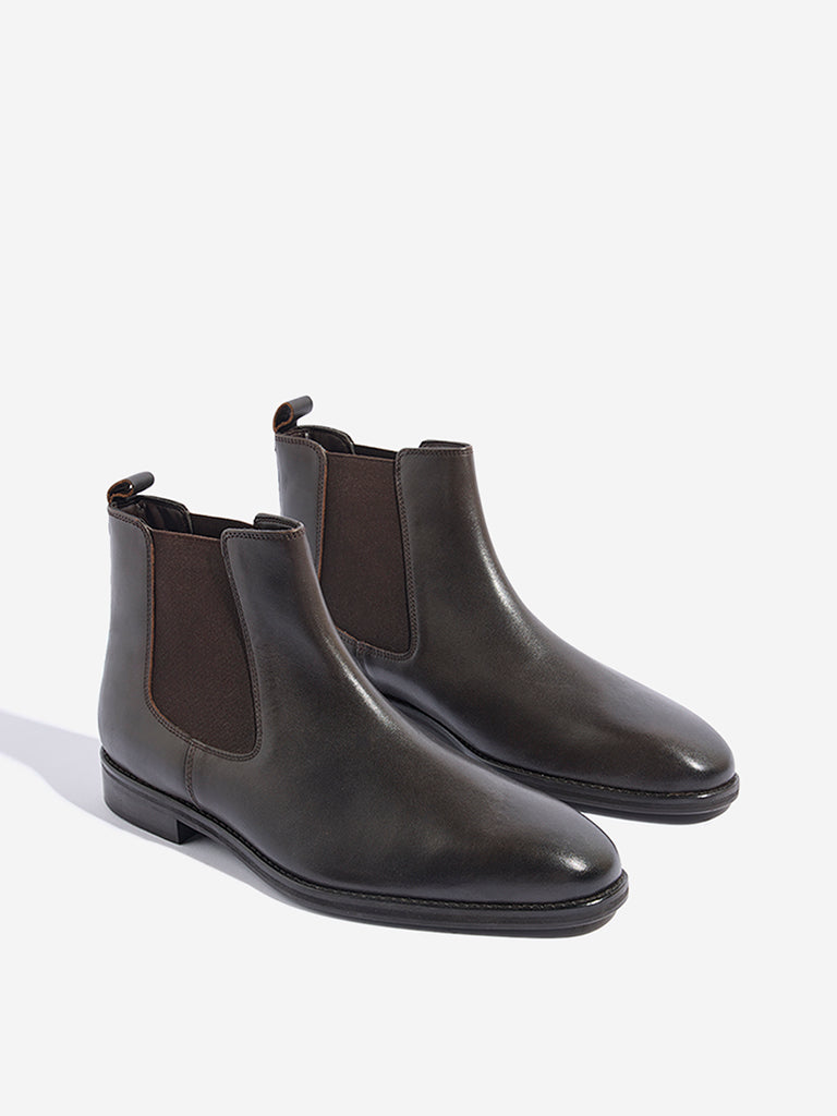 Soleplay presents these dark brown Chelsea boots made with smooth faux leather for a classic finish. Designed with elasticated side panels for easy wear. they feature a low heel and a streamlined silhouette??perfect for both casual and semi-formal looks.