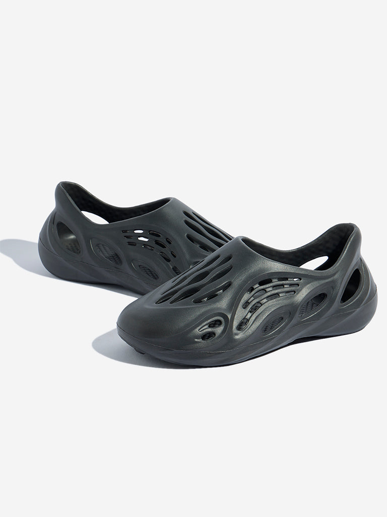 These dark grey rainy clogs from Soleplay feature a sculpted silhouette with a distinctly modern edge. The upper is designed with elongated slits along the front and oval cutouts on the sides. offering both visual interest and enhanced breathability. Easy to slip on and off. the pair is grounded with a ridged outsole for dependable traction.