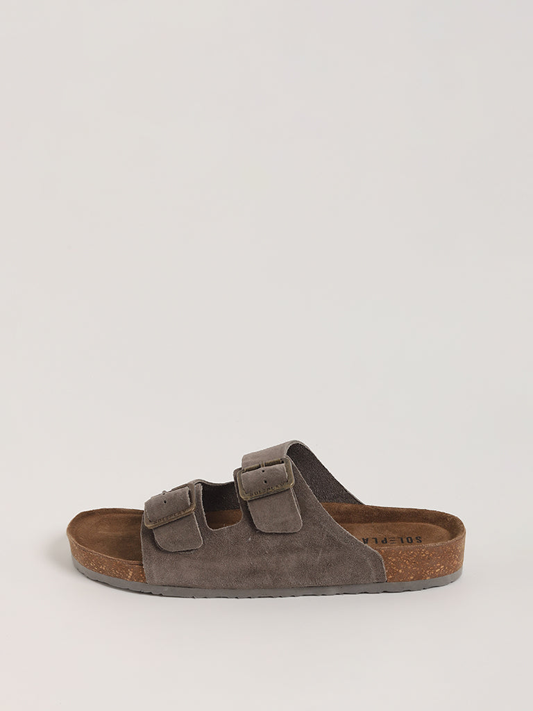 Double band sandals by Soleplay. offering grey suede strap with buckle. EVA sole for comfort.