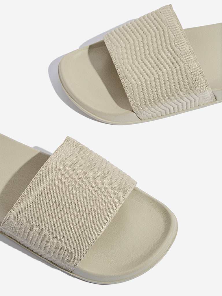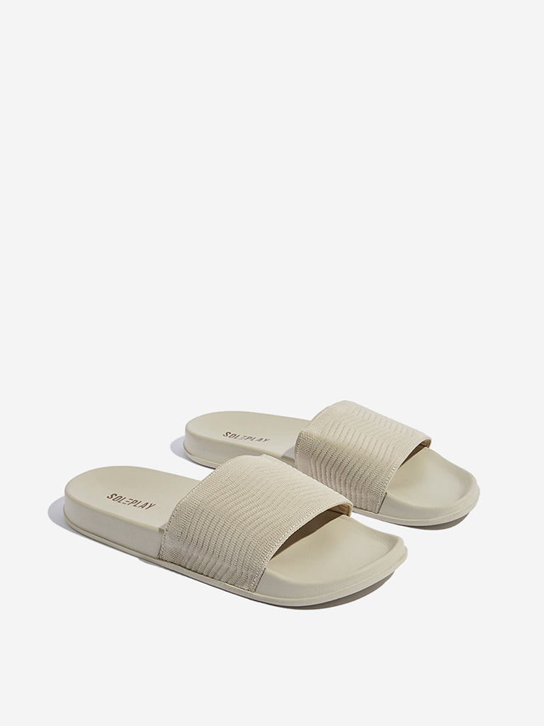 Soleplay presents these ivory slides made for everyday ease. featuring a wide chevron-textured strap ensuring a secure fit. The soft insole enhances comfort. while the textured sole allows effortless movement. serving as a versatile choice for casual wear. indoors or out.