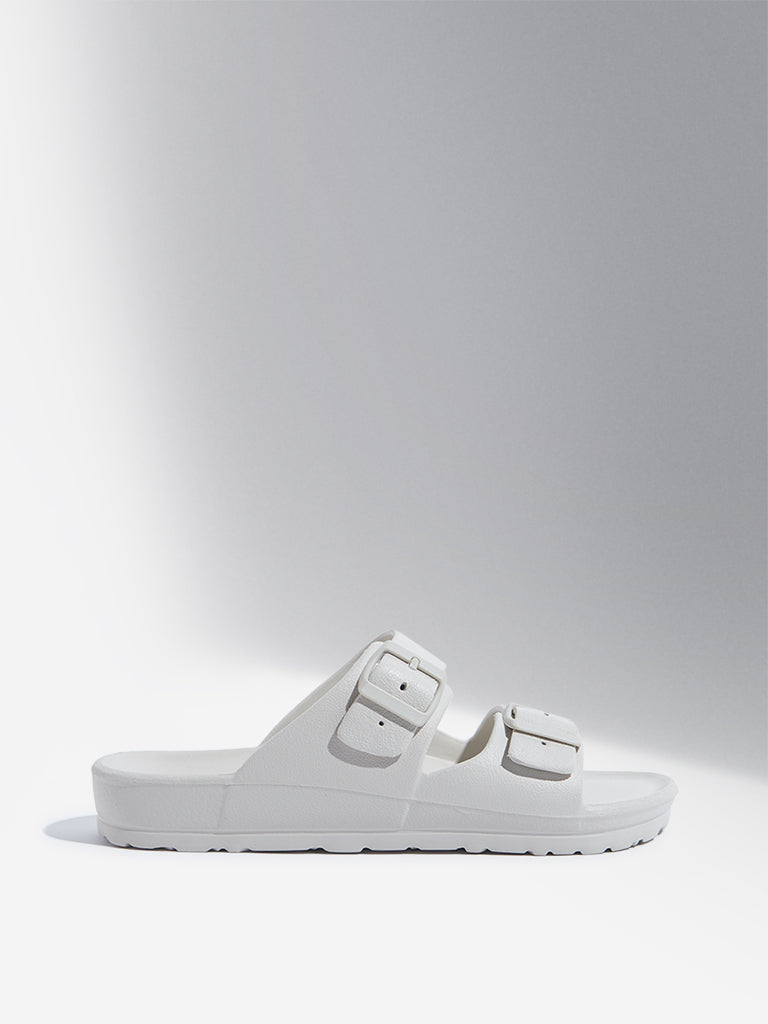 These ivory flip-flop by Soleplay are designed with dual-buckled straps for a firm grip. They feature a cushioned footbed. sturdy midsole. and textured outsole for a slip-proof walking experience.