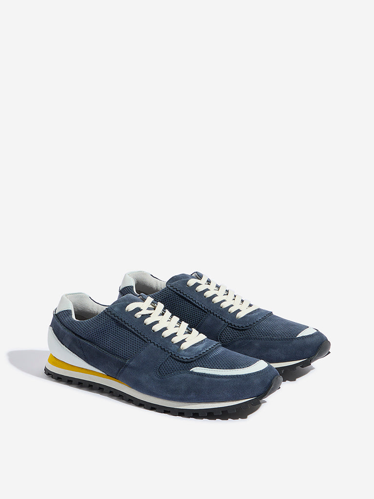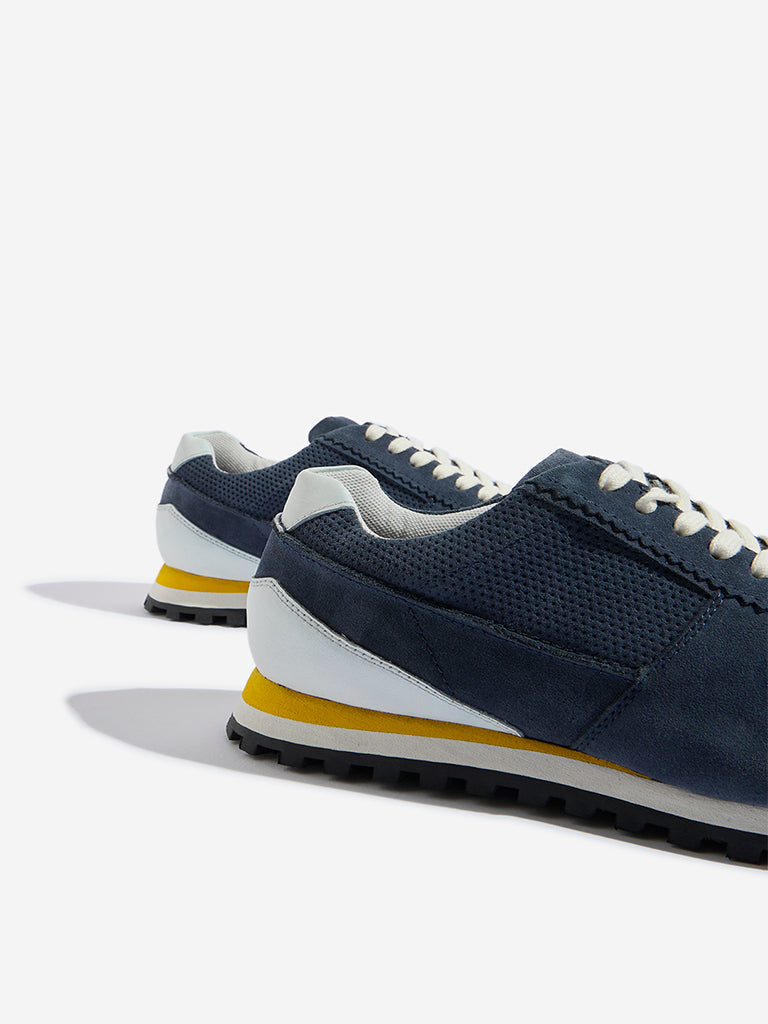 Soleplay introduces these navy lace-up sneakers. featuring perforated detailing on the exterior for enhanced breathability. The contrasting white laces and a subtle yellow stripe along the midsole add a striking touch of colour. Designed for all-day ease. they come with a cushioned footbed for superior comfort. while the textured outsole provides reliable traction.