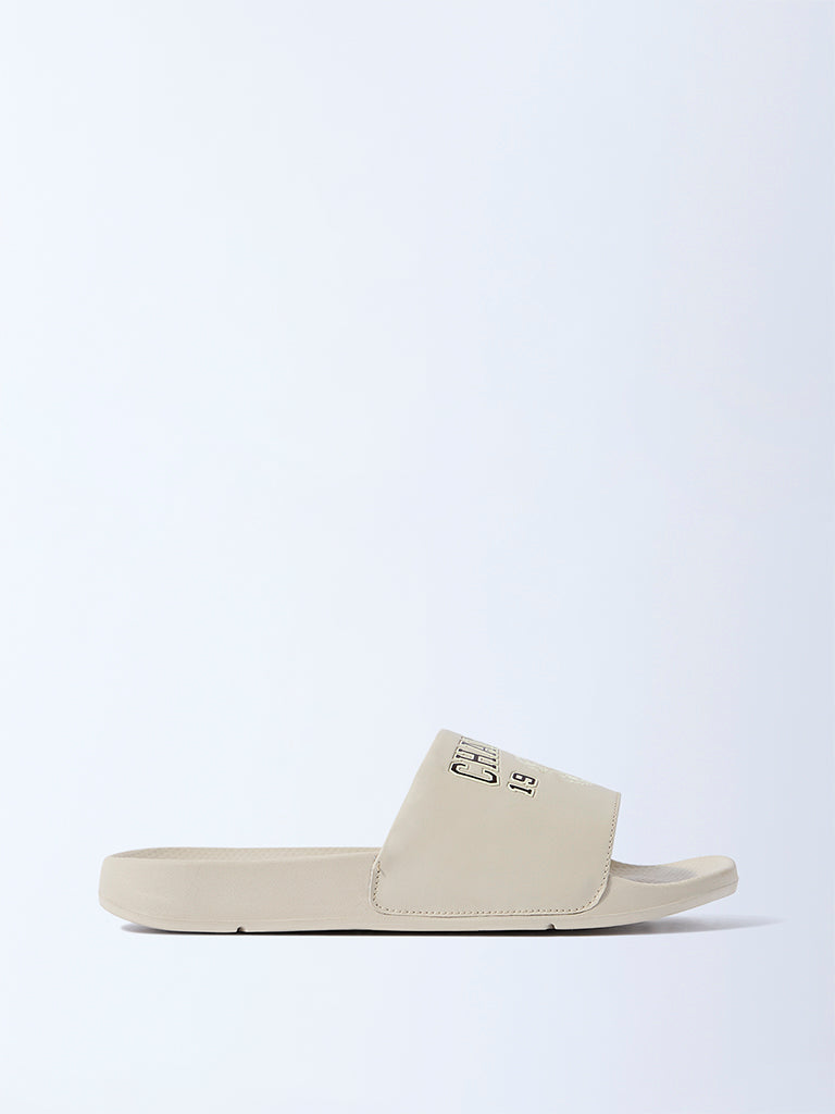 Keep your poolside look fresh with these off-white slides from Soleplay. fashioned with a wide strap stamped in bold typographic prints. A textured insole delivers all-day comfort. while the ridged outsole ensures steady grip??perfect for lounging by the water or easy days in the sun.