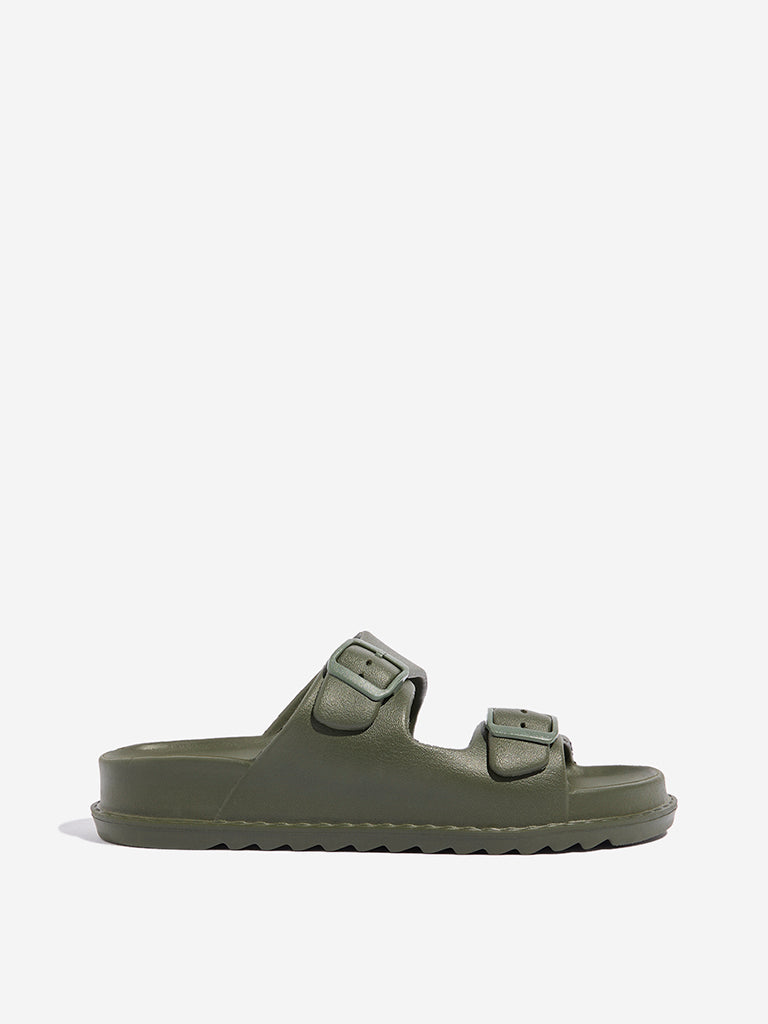 These olive double band sandals by Soleplay feature dual buckle straps on the upper for a secure fit. With a soft insole. textured outsole. and water-resistant design. they are perfect for casual outings. offering both comfort and durability.