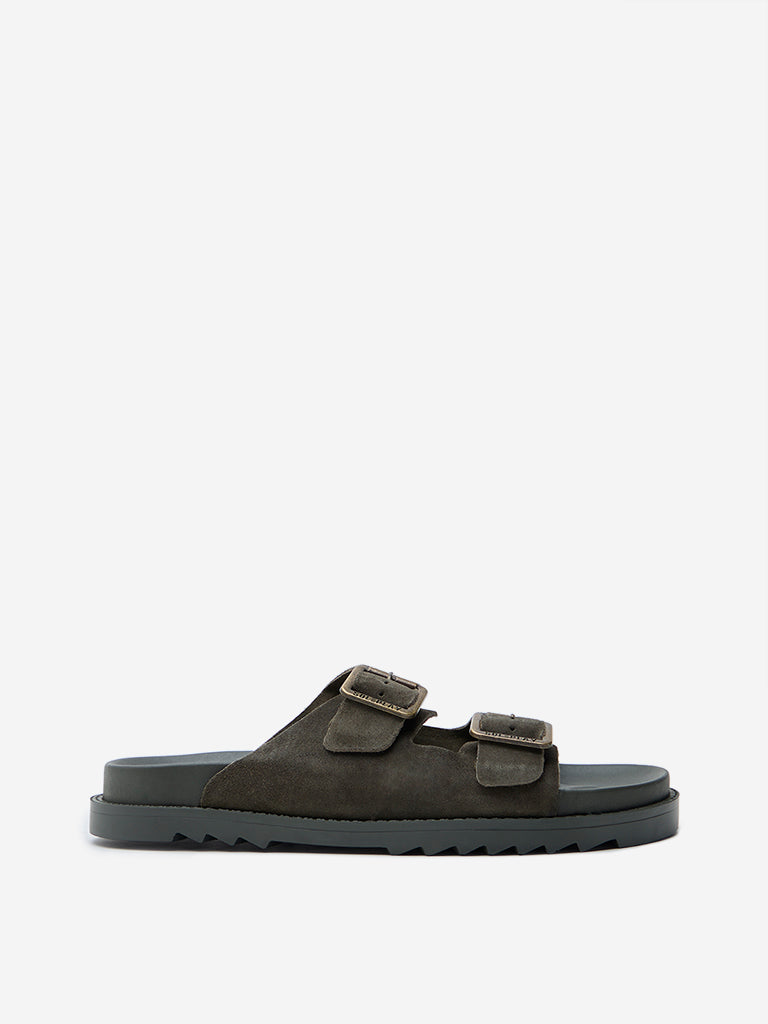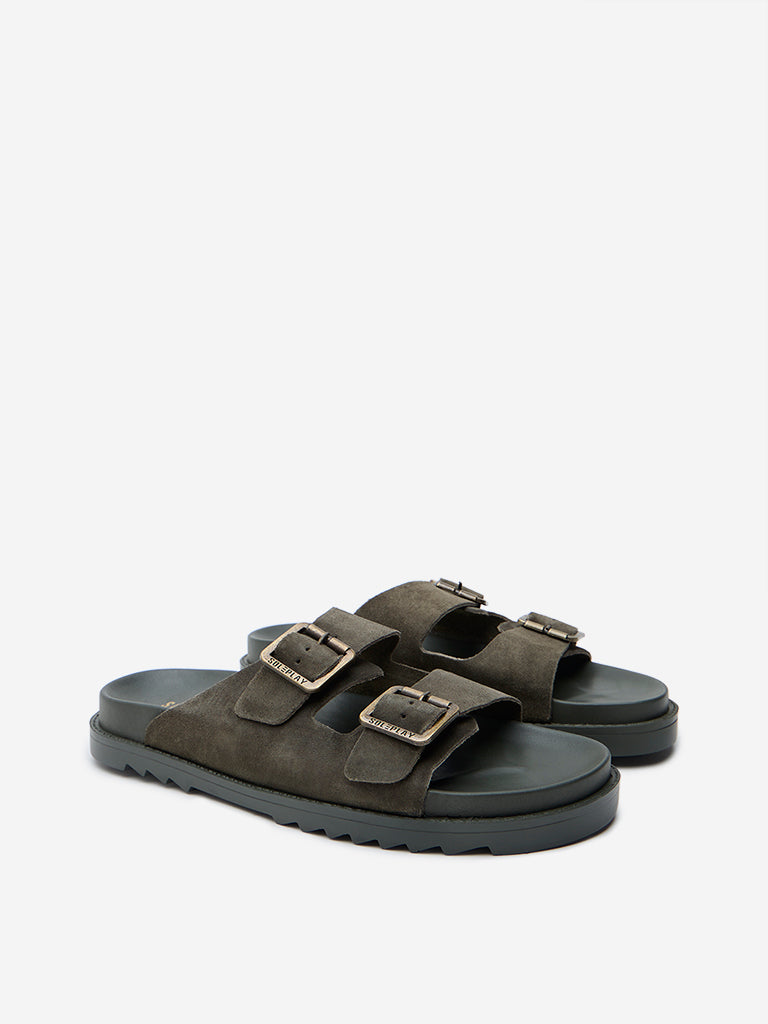 Soleplay presents these olive slip-on sandals crafted with genuine leather. The footwear features a double belted upper including a cushioned insole and a textured outsole for a great walking experience.