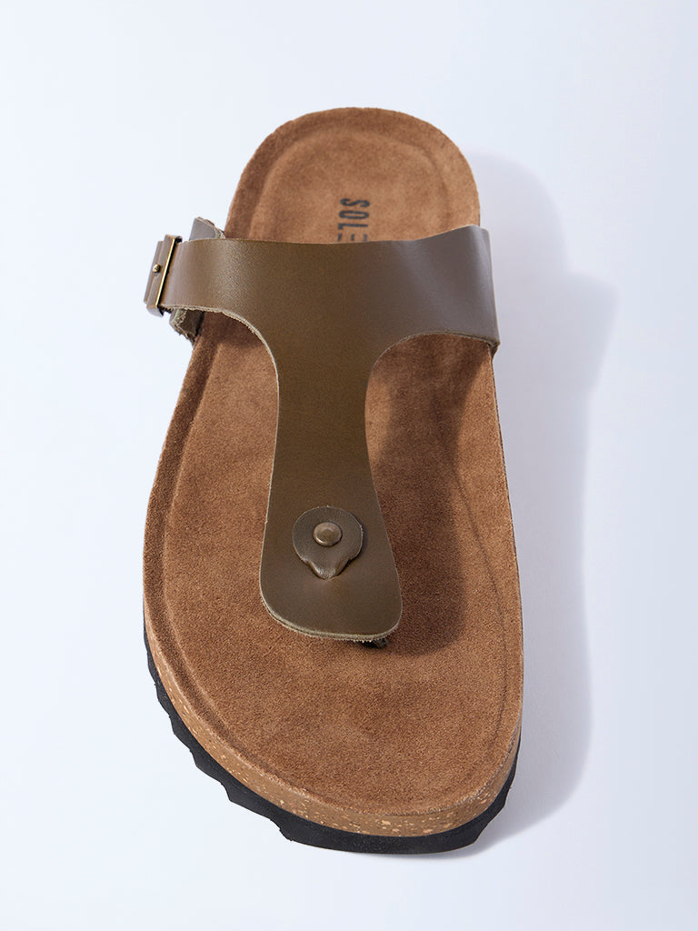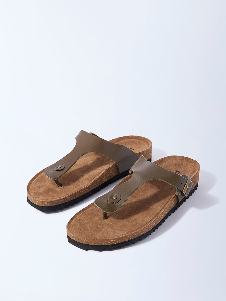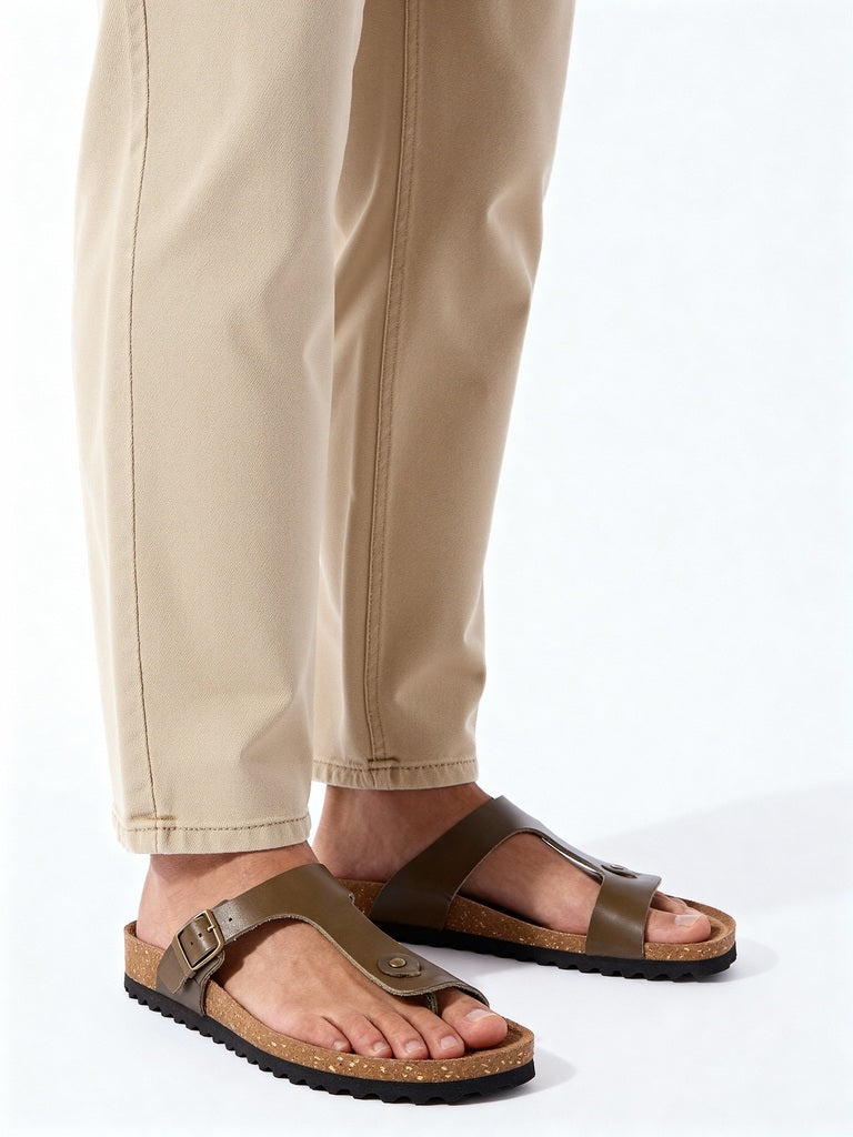 Bring a rugged edge to warm-weather dressing with these olive sandals from Soleplay. Designed in a thong-strap silhouette with a side buckle closure. they balance laid-back ease with everyday function. A contoured footbed and padded insole keep comfort at the forefront. while the cork-inspired midsole and ridged outsole deliver stability and style in equal measure.
