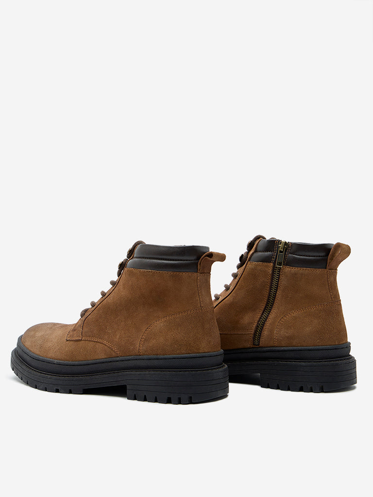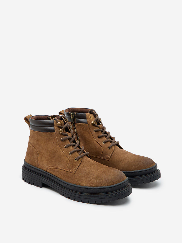Elevate your edge with these tan biker boots by Soleplay. They combine style and functionality with their rich faux suede exterior. Featuring a secure lace-up design for a proper fit. these boots also include a soft insole and cork-textured outsole for enhanced comfort and durability.