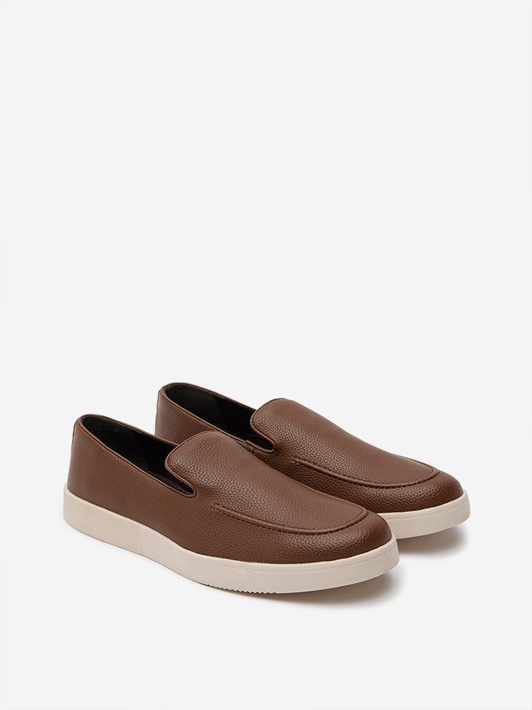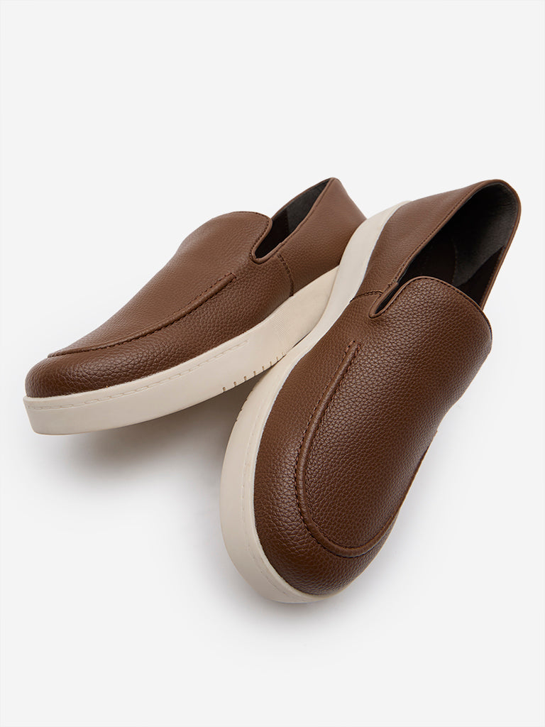 Sole play’s tan slip-on loafers feature an elevated upper for a refined. stylish look. Built with durable materials. they offer a soft insole for comfort. a supportive midsole. and a textured outsole for reliable traction??perfect for day-to-night wear.