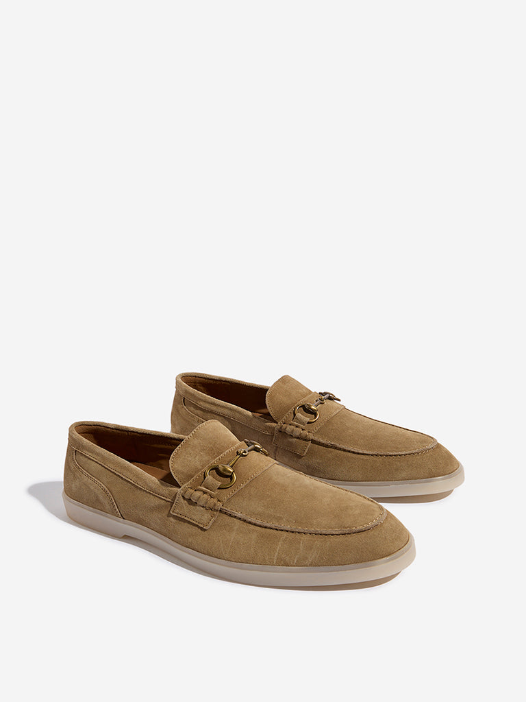 These taupe loafers by Soleplay are crafted from soft leather-suede and feature sleek metal detailing on the upper for a refined look. Designed for both style and comfort. they offer a cushioned insole for all-day wear and a durable outsole for lasting performance.