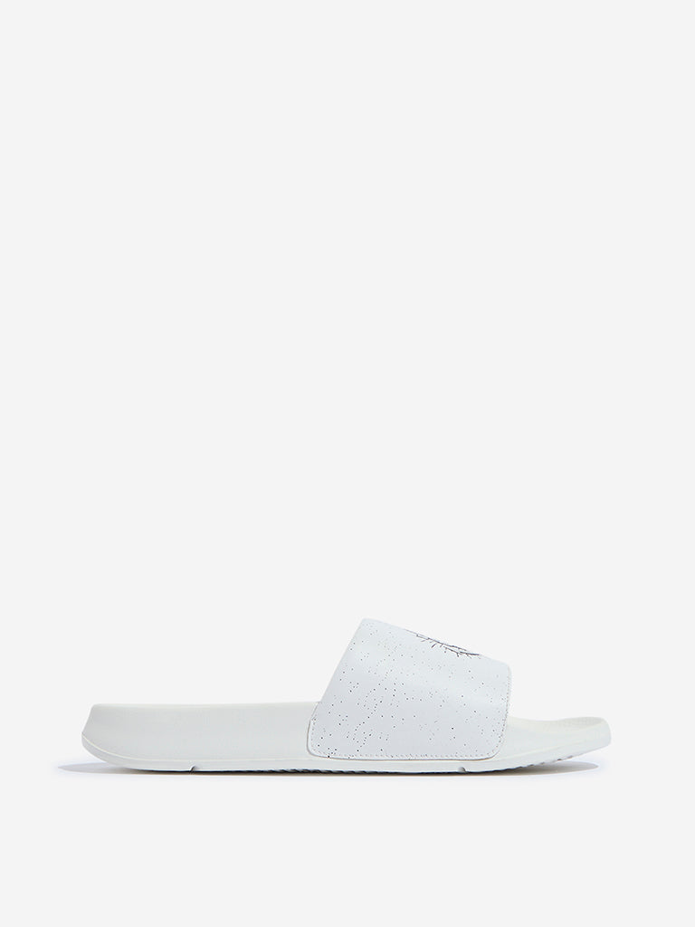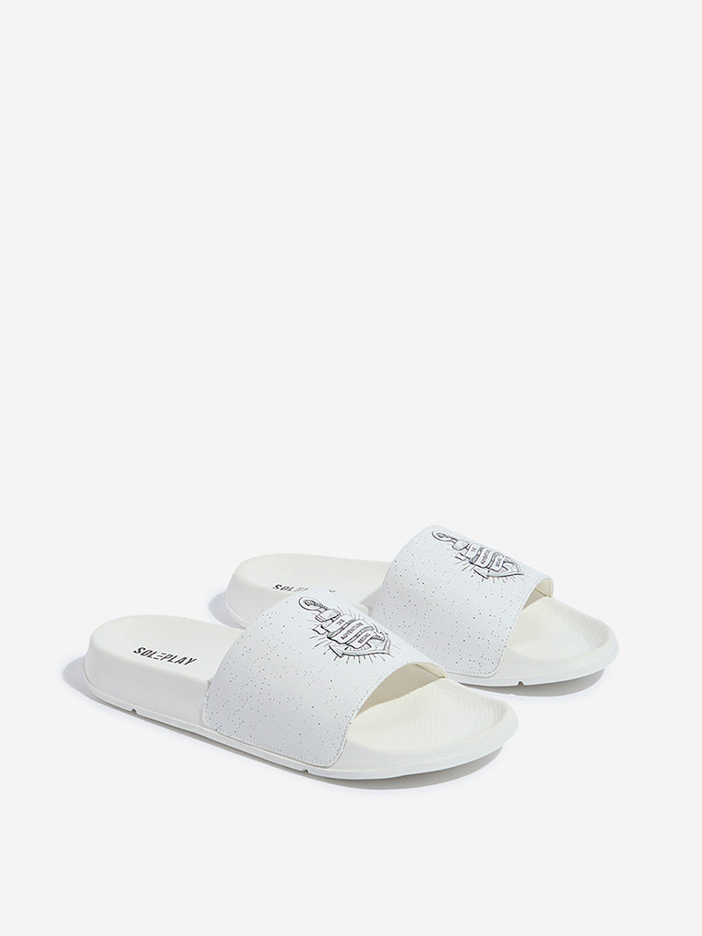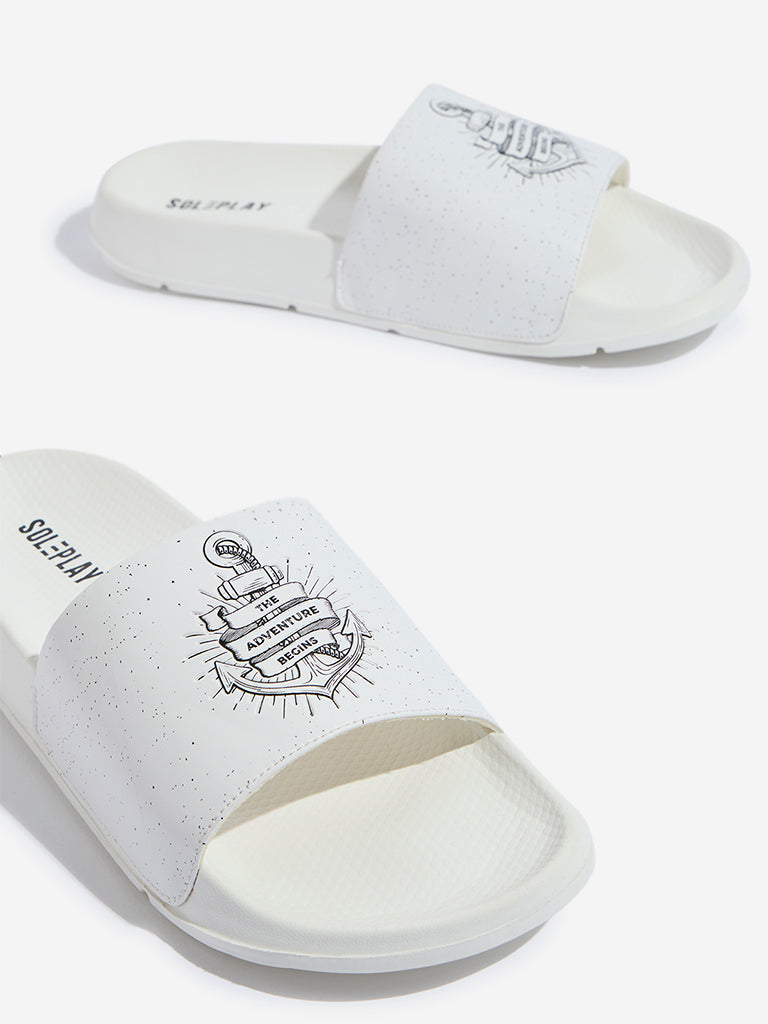 Soleplay presents these white pool slides showcasing text designs coupled with speckle detailing on the broad strap. The soft footbed ensures all-day comfort. while the durable outsole provides excellent grip. making them perfect for casual wear and poolside lounging.