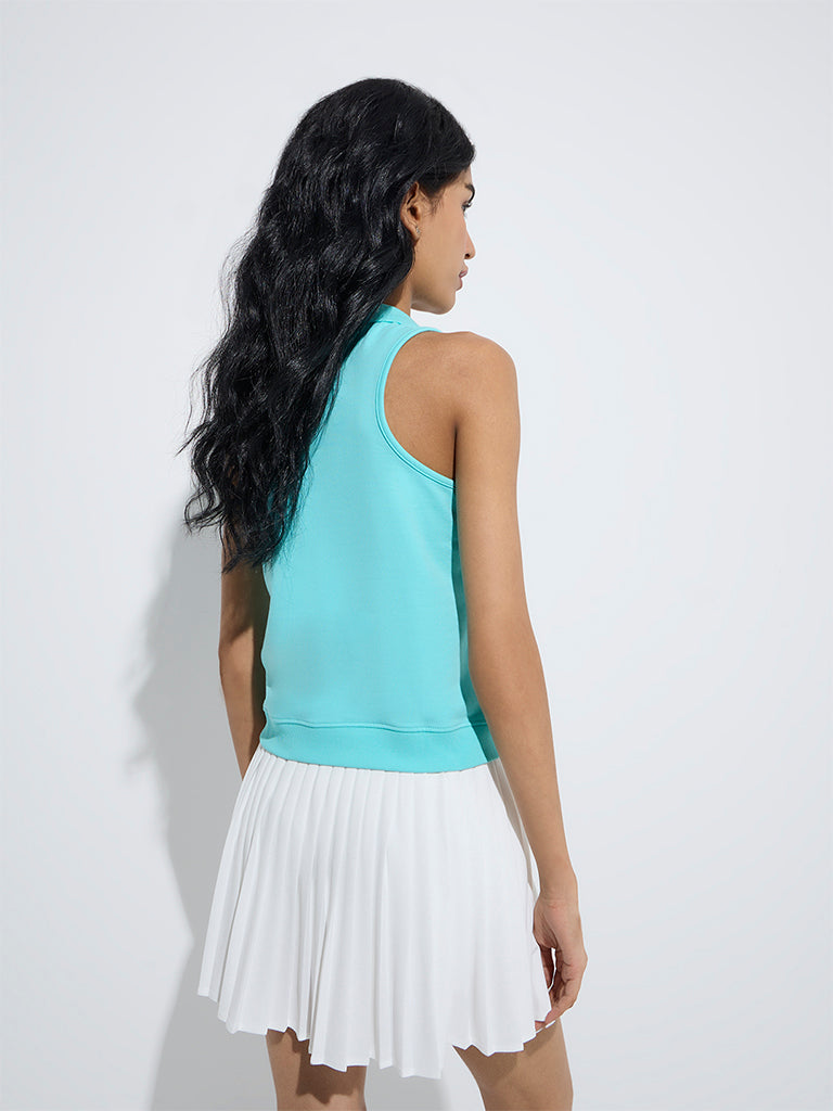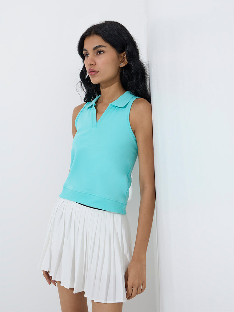 This aqua t-shirt from Studiofit is a refreshing choice for casual wear. Made from a sumptuous ribbed-textured fabric. it features a V-neck collar and a sleeveless cut for a breezy finish.