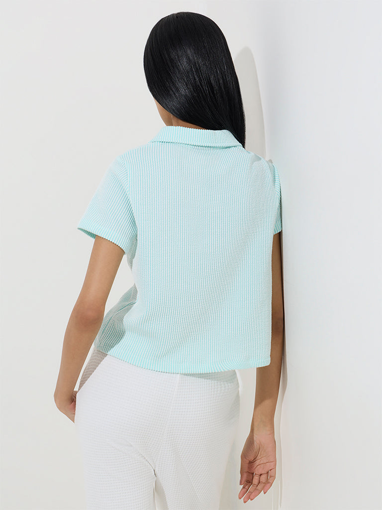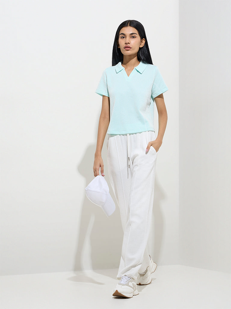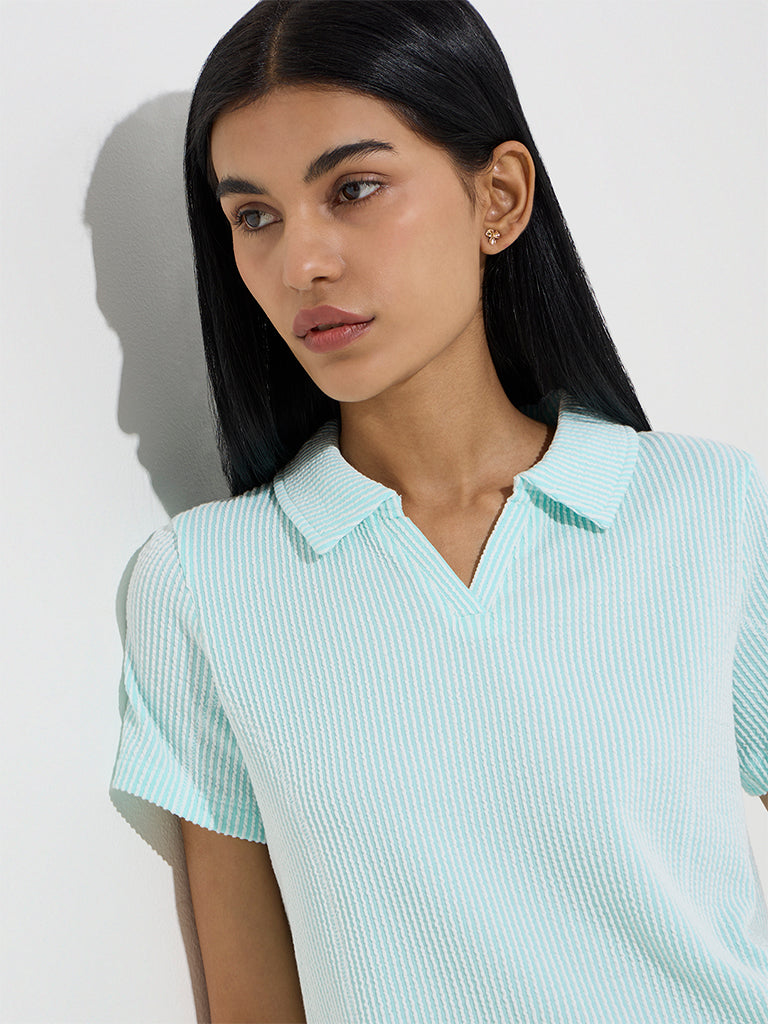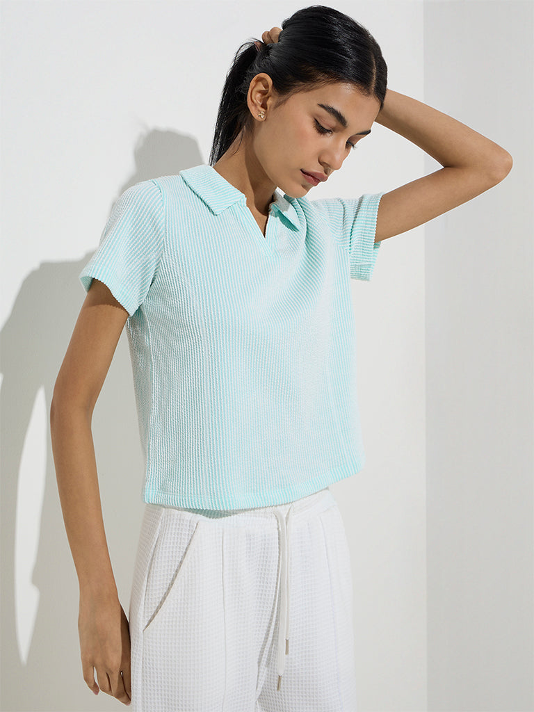 This aqua tee from Studiofit is styled with striped patterns for a sporty flair. Cut from a cotton-blend fabric. it features a V-neck collar and short sleeves. making it a versatile choice for both workouts and everyday athleisure looks.