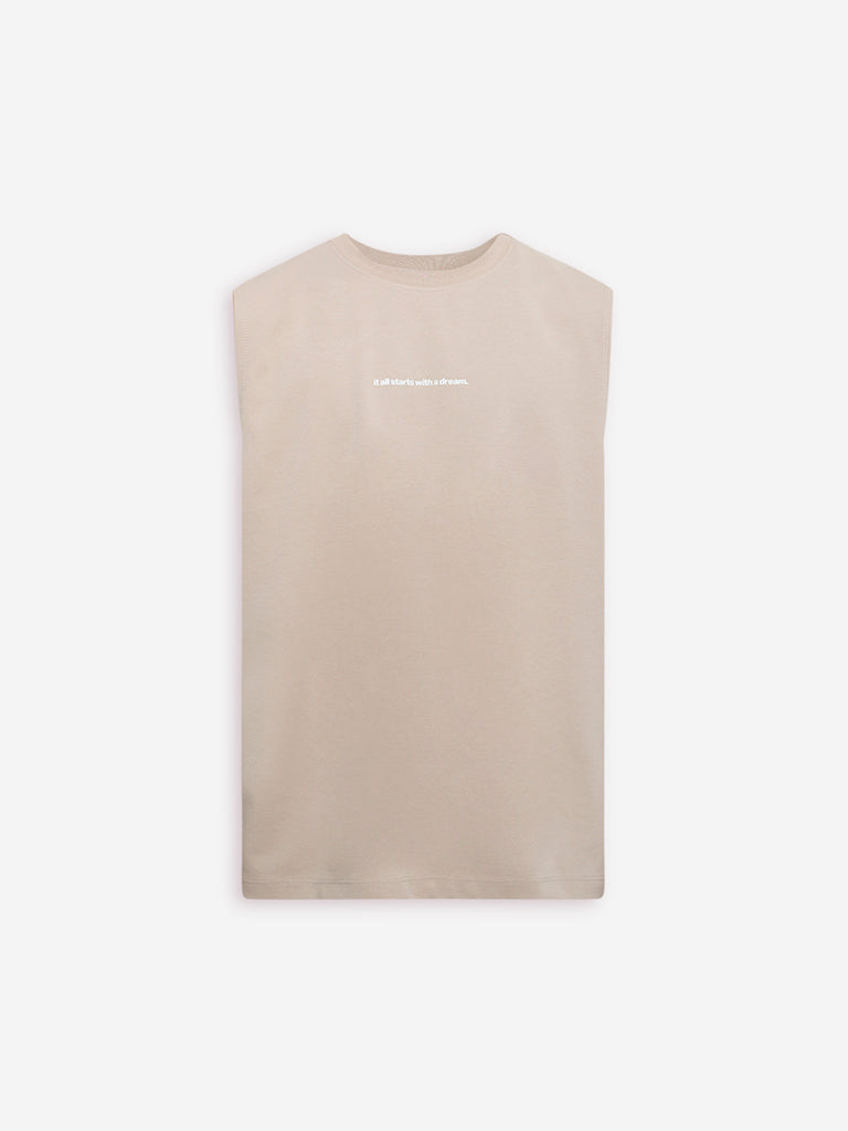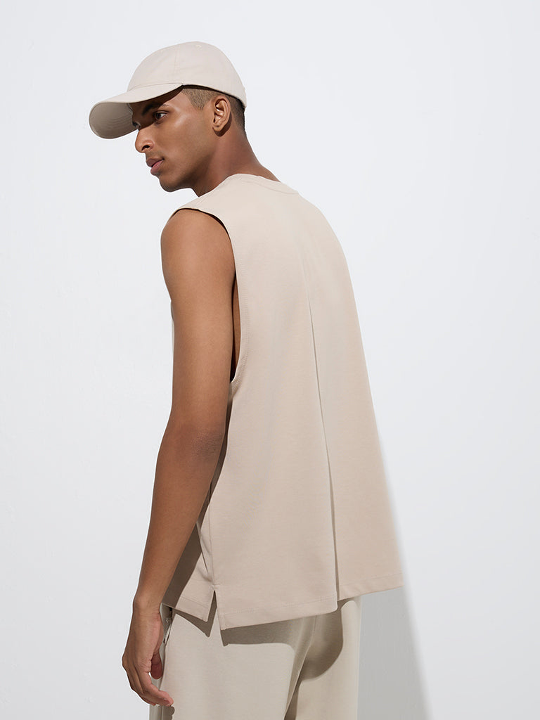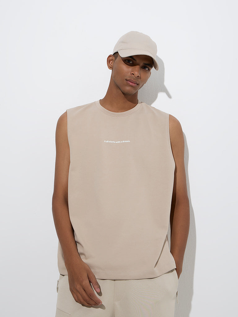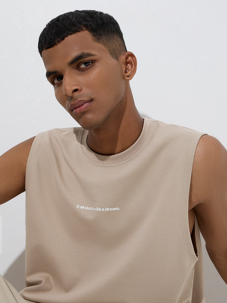 This beige t-shirt from Studiofit is elevated by subtle text detailing at the front. Cut from a blended cotton fabric. it’s styled with a crew neck and a sleeveless silhouette. making it a breezy go-to for laid-back days when comfort and quiet style go hand in hand.
