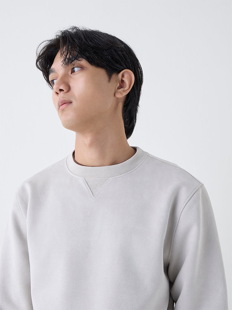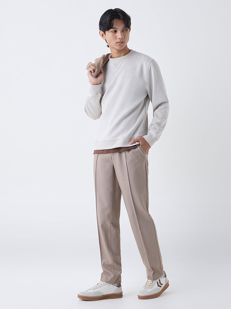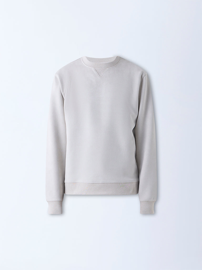 Studiofit Beige Solid Relaxed-Fit Suede Sweatshirt