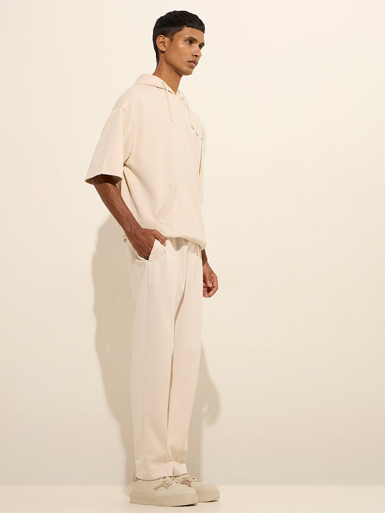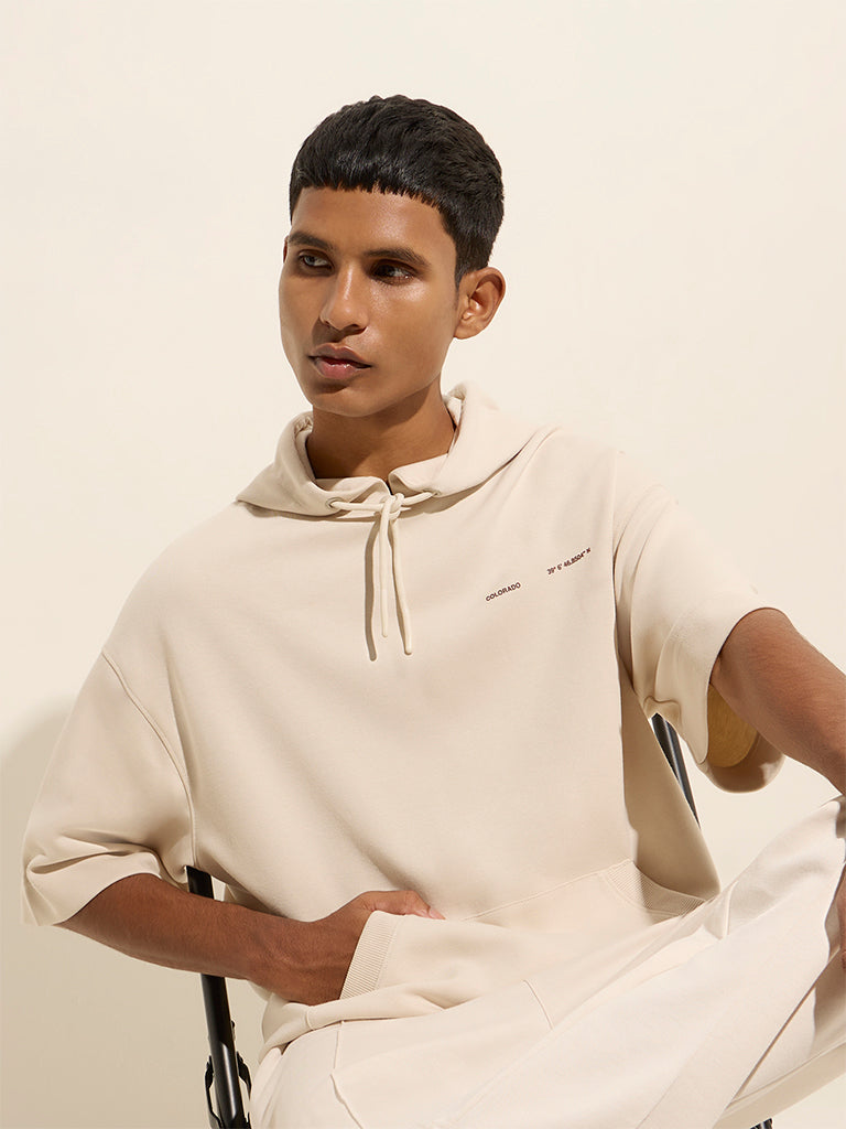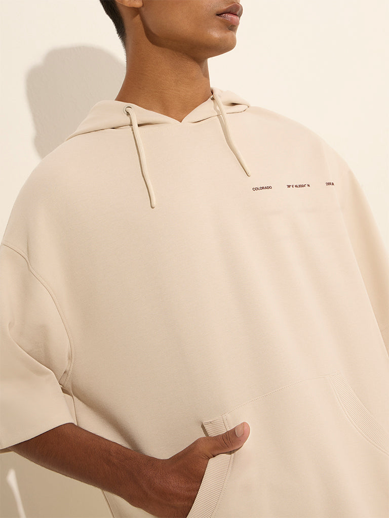 Studiofit Beige Text Design Relaxed-Fit Cotton-Blend Hoodie