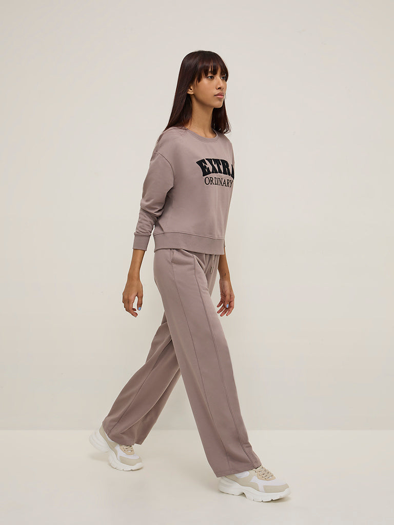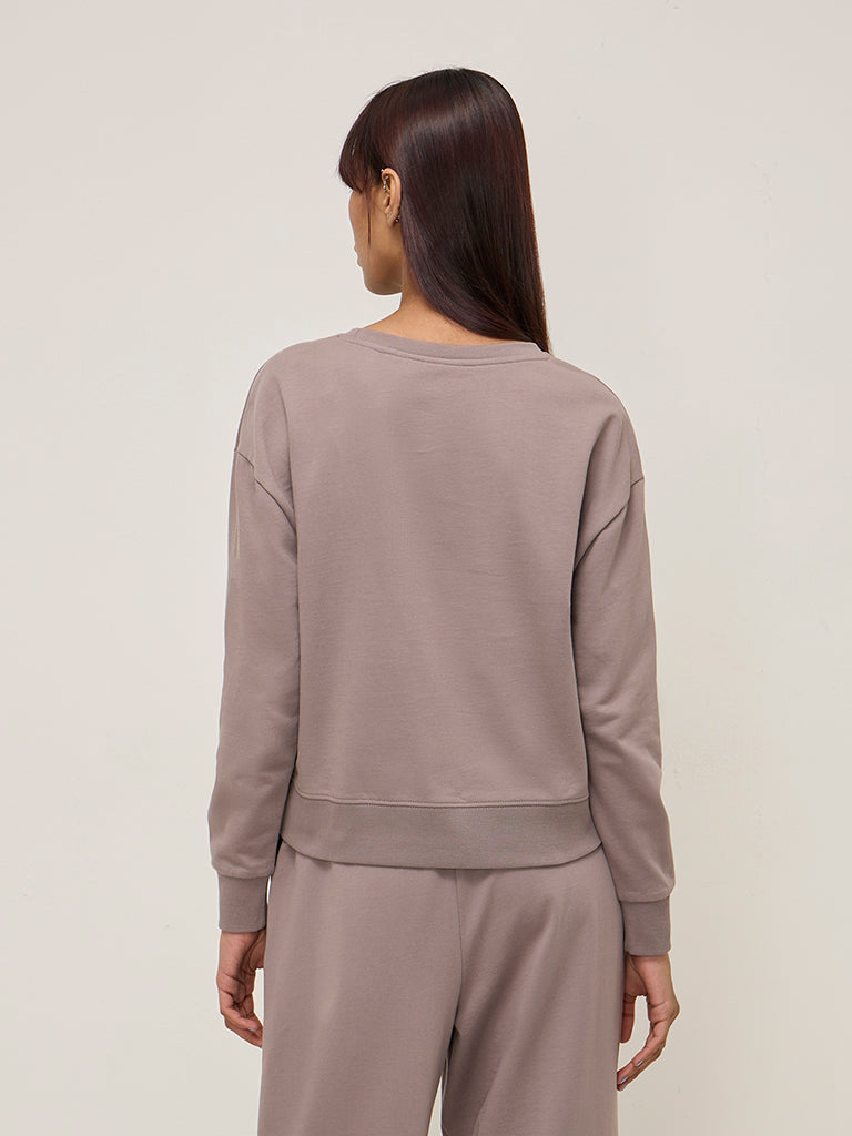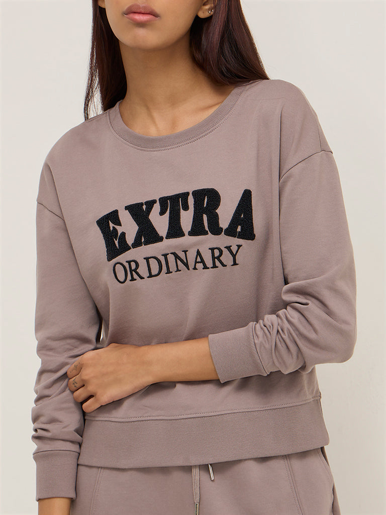 Studiofit Beige Text Embroidered Cotton Sweatshirt