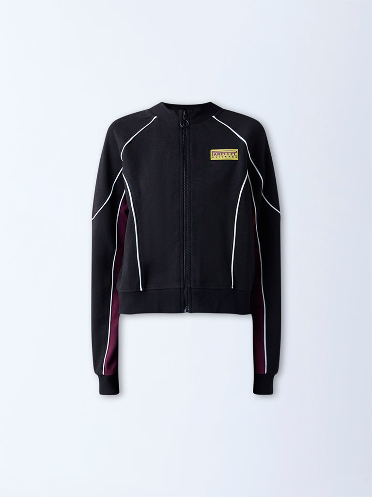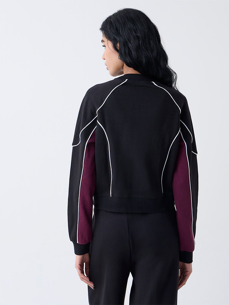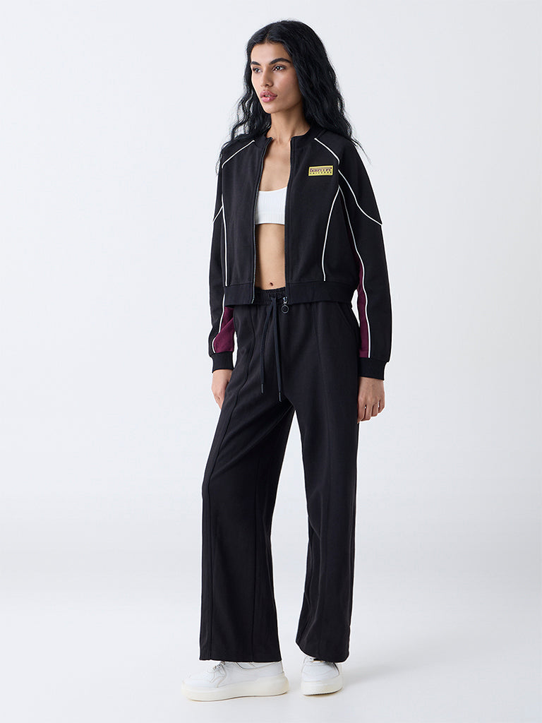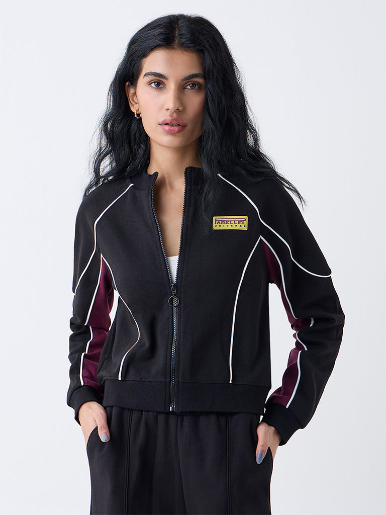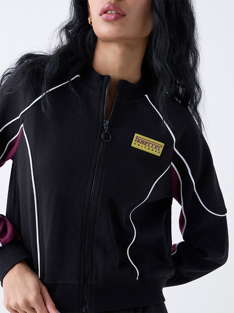 Channelling an athletic aesthetic. this black jacket from Studiofit features contrast pipeline detailing for a dynamic touch. It’s styled with a high neck. raglan sleeves and a front zipper for a sleek profile. Crafted from premium-blend fabric. it ensures comfort and flexibility. while ribbed trims lend a polished finish.