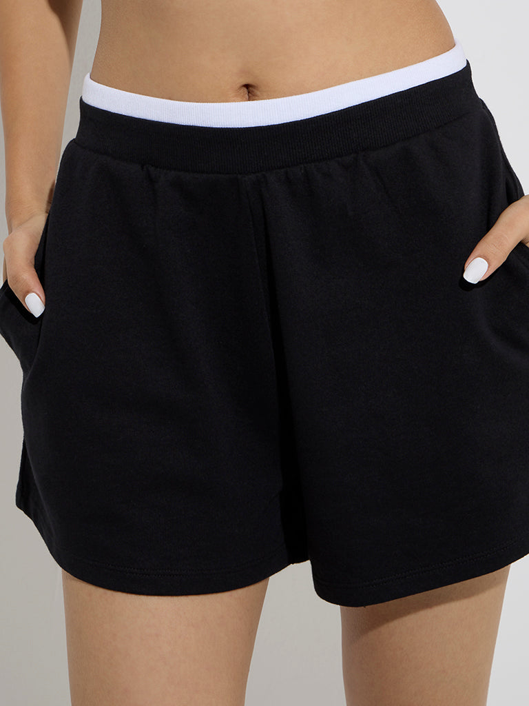 Studiofit presents this black shorts fitted with a ribbed elastic waist and convenient side pockets. Built from pure cotton fabric with a high-rise. this comfortable bottom serves as a versatile addition to your athleisure rotation.