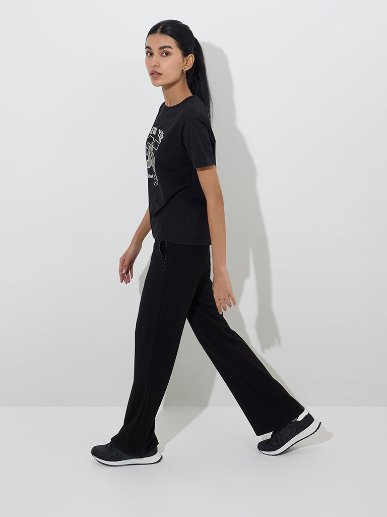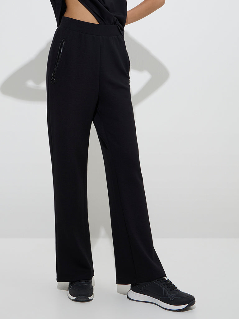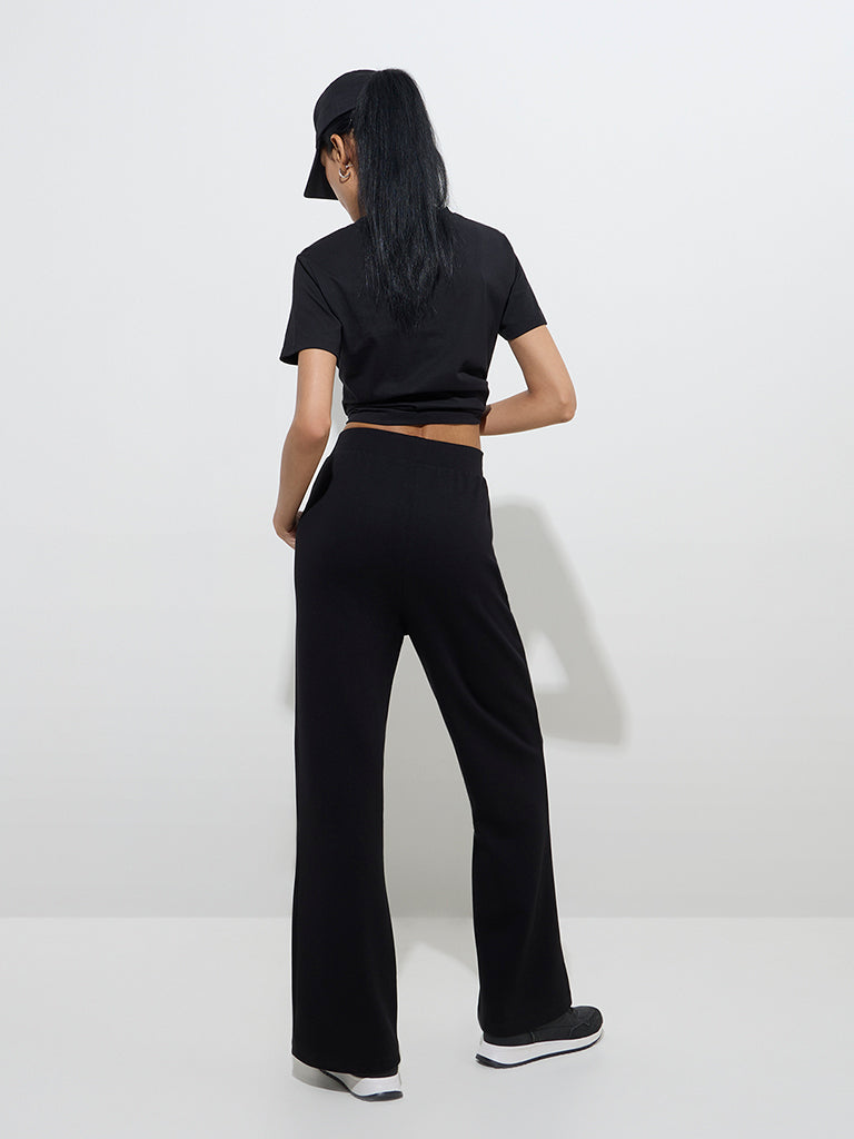 Studiofit brings you these black activewear track pants designed in a stylish flared cut. Made from quality fabric. the high-rise bottom wear carries a smooth elastic waistband and side pockets.