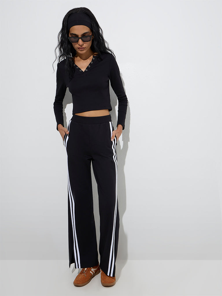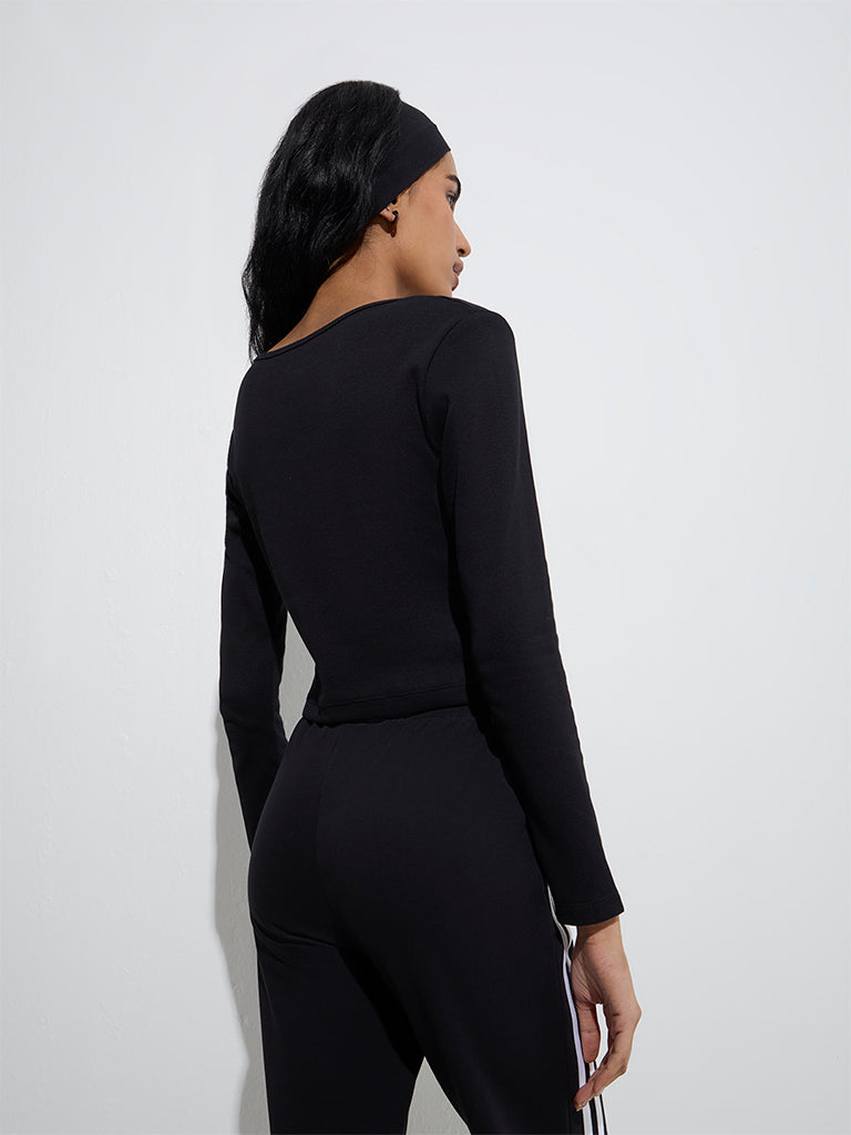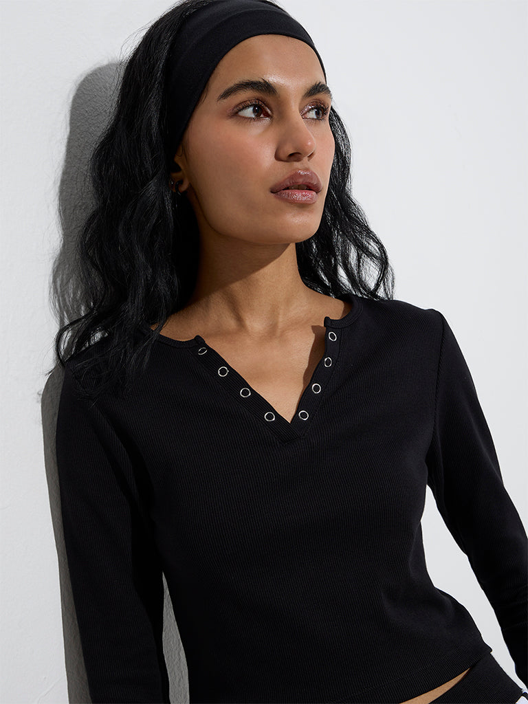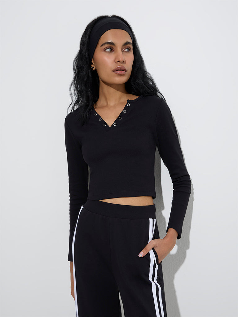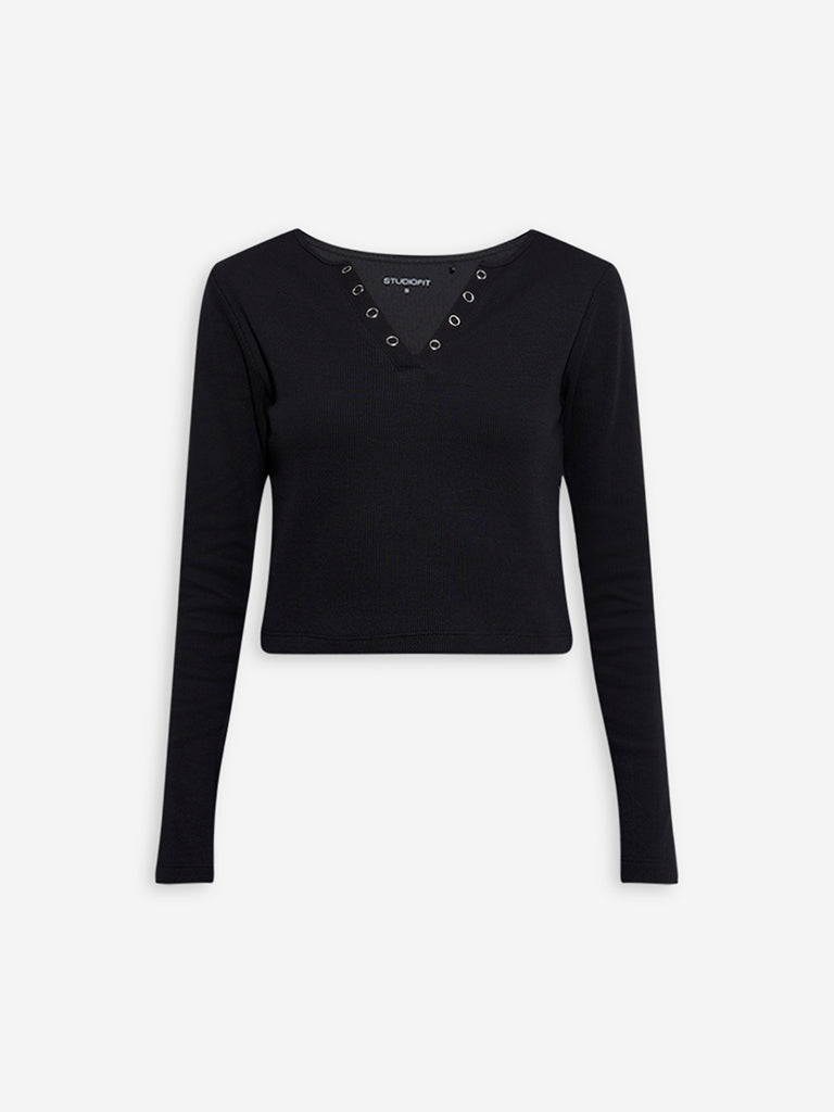 This black tee from Studiofit is crafted in a ribbed profile for a structured feel. The Henley neckline is elevated with sleek metal detailing. while full sleeves lend a cosy feel. Made from a sumptuous cotton-blend material. it’s a versatile essential for both active and casual wear.