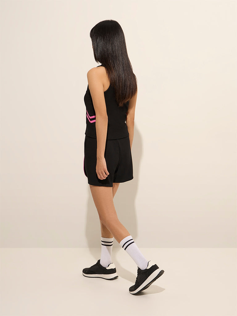 Studiofit brings you this black skort offering ribbed texture. It soft and stretchable fabric build ensures carefree movement. The smooth elastic waistband and side pockets elevate the convenience presented by this activewear.