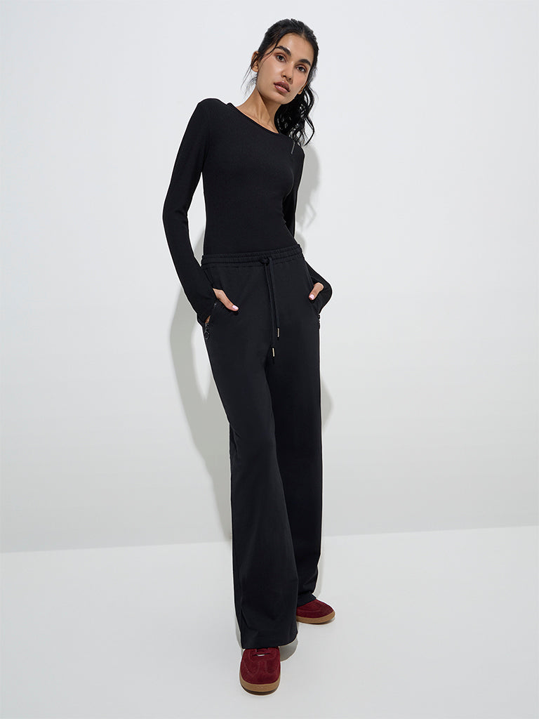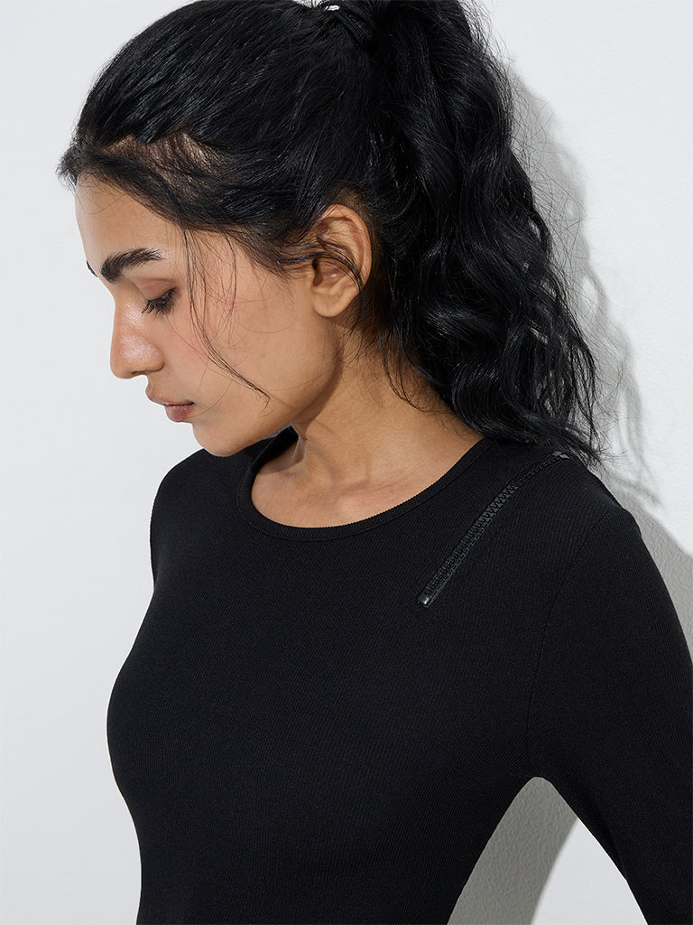 This black bodysuit by Studiofit is fashioned with a ribbed texture. Made from a lightweight fabric. the garment boasts a zipper for a stylish appeal. The round neck and full sleeves complete this activewear.