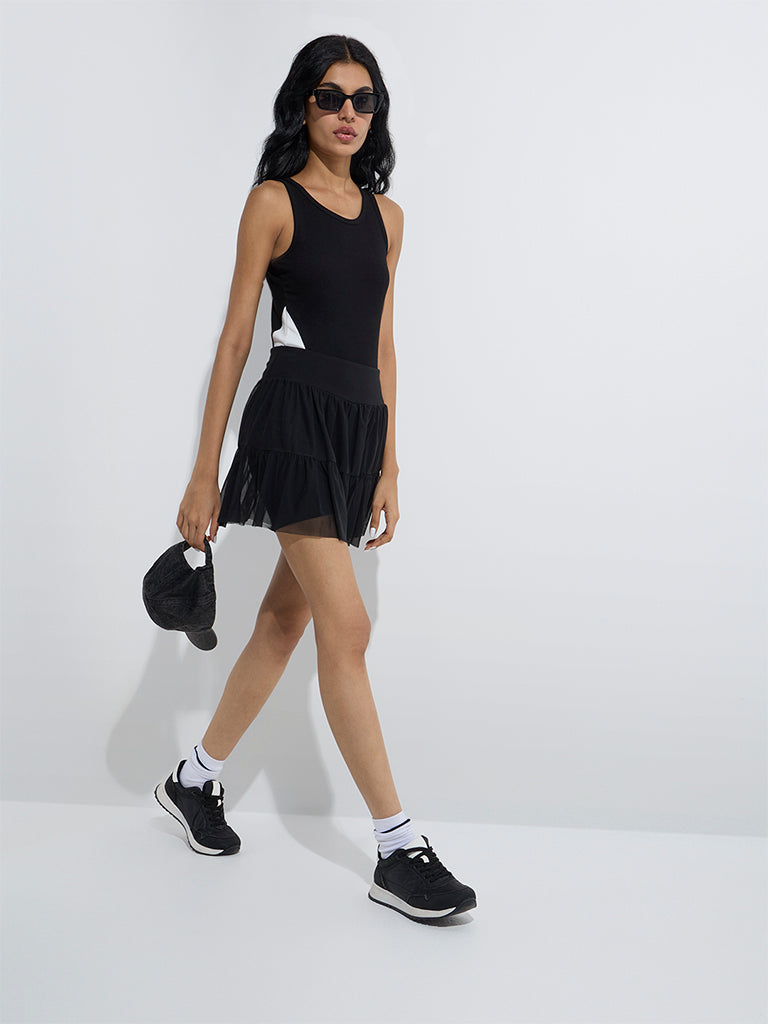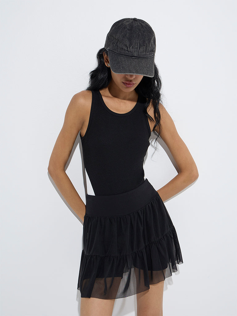 This black bodysuit from Studiofit adds a sporty edge to your activewear. Spun from a breathable fabric. it features a ribbed texture for a flattering fit. Finished with a round neck and sleeveless cut. it’s perfect for pairing with high-waisted bottoms.