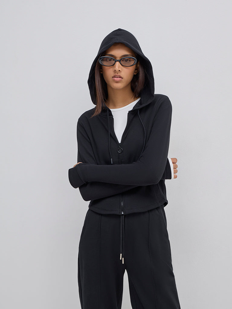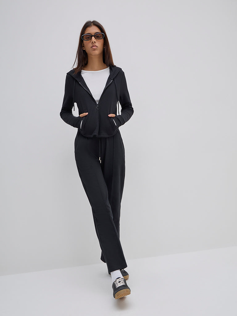 This black jacket from Studiofit is crafted with ribbed designs. Made from a breathable fabric. it includes a hood with adjustable drawstrings. zipper placket. and full sleeves.
