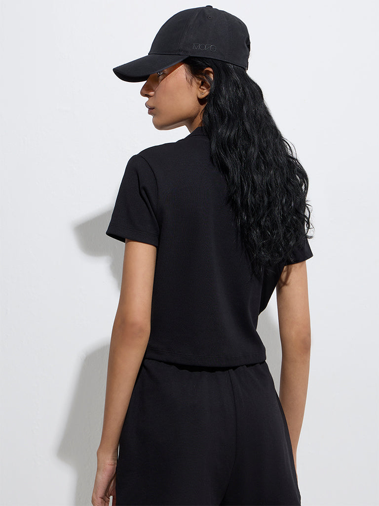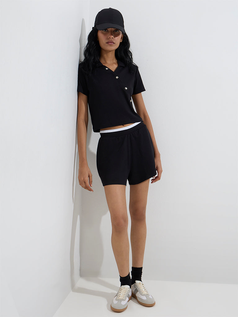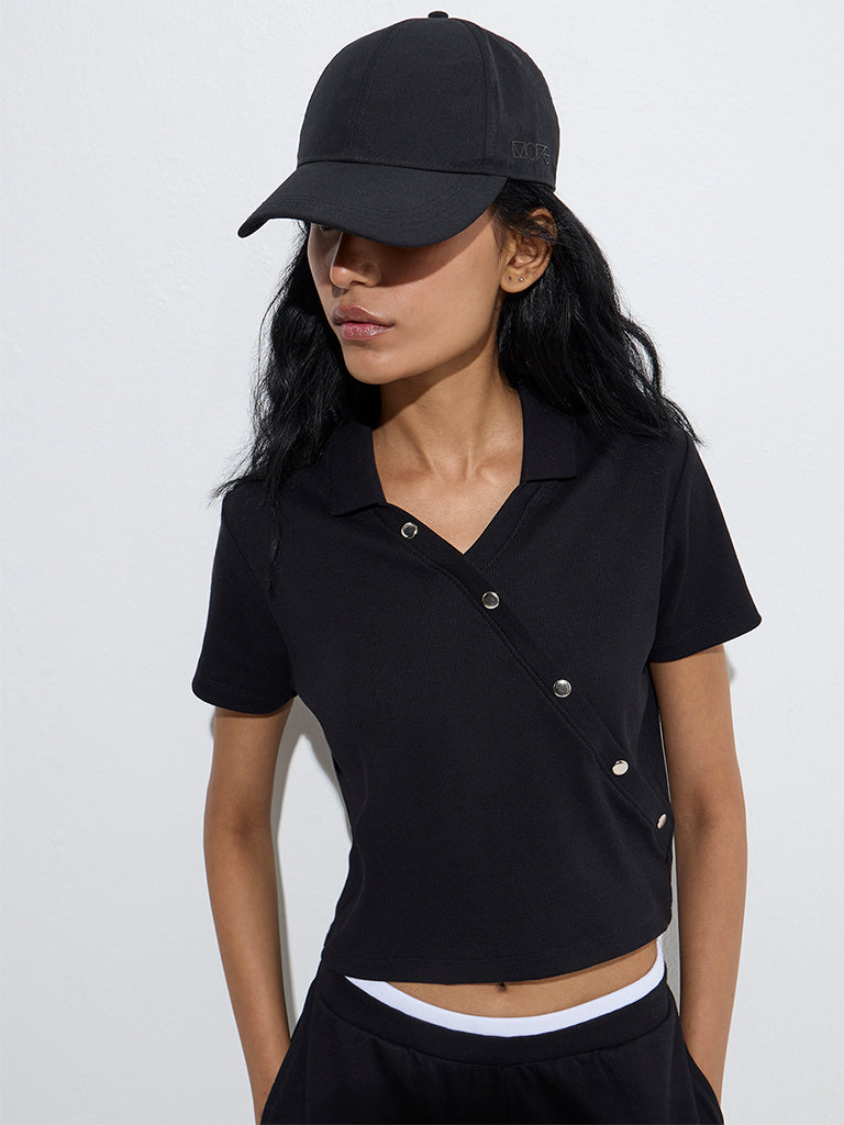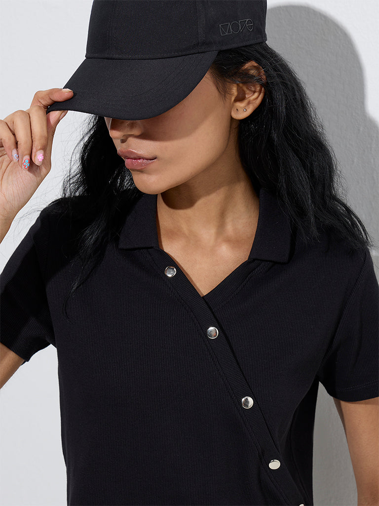 This black tee from Studiofit is woven from a ribbed cotton-blend fabric that flexes with movement while holding its shape. The V-neck collar and short sleeves keep the silhouette clean. while the asymmetrical faux button placket introduces a subtle design twist.