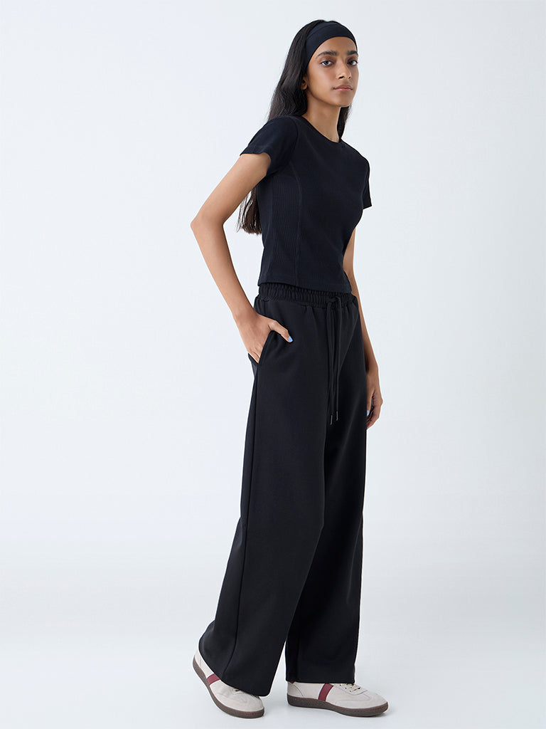 Studiofit Black Ribbed-Textured Cotton-Blend T-Shirt