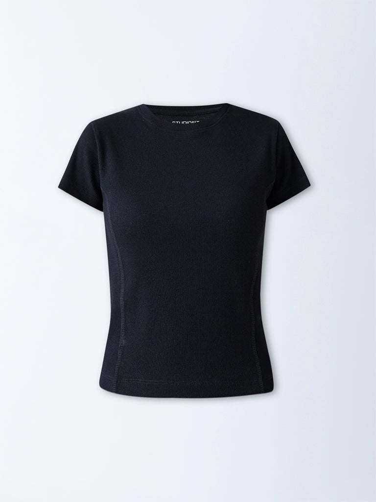 Studiofit brings a sleek upgrade to your off-duty edit with this black t-shirt. Woven from a sumptuous ribbed-textured fabric that contours comfortably. it’s framed with a classic round neck and short sleeves.