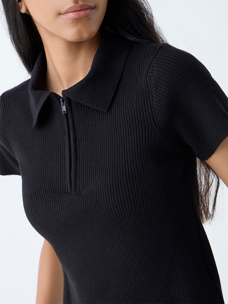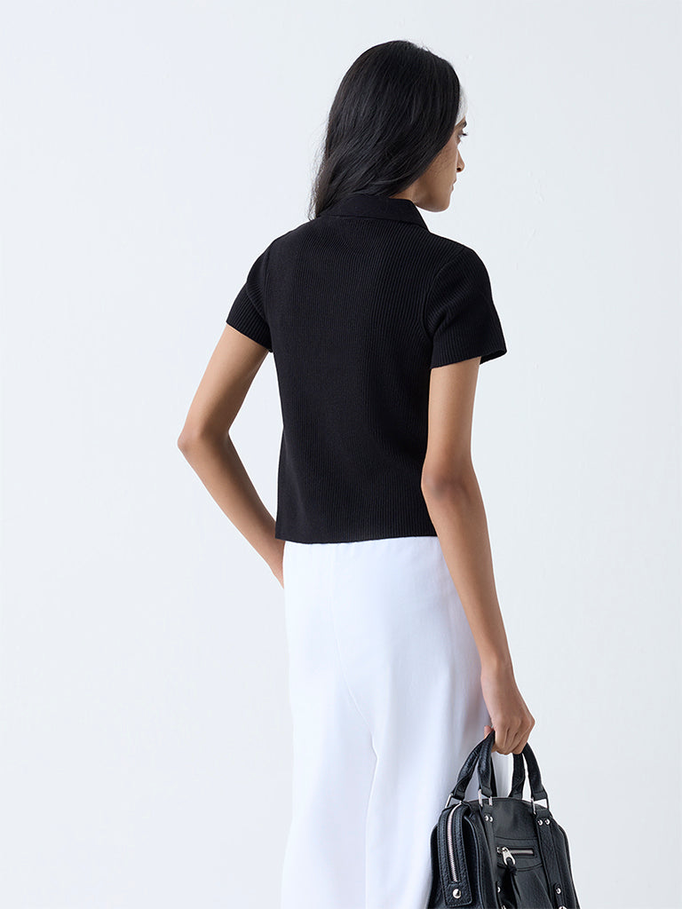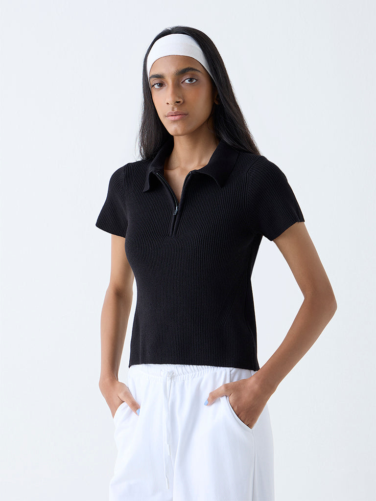 Studiofit Black Ribbed-Textured Quarter-Zip Polo T-Shirt