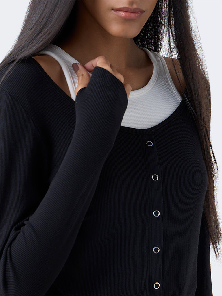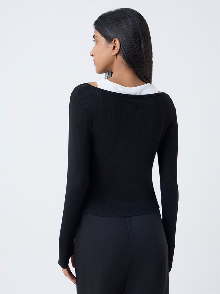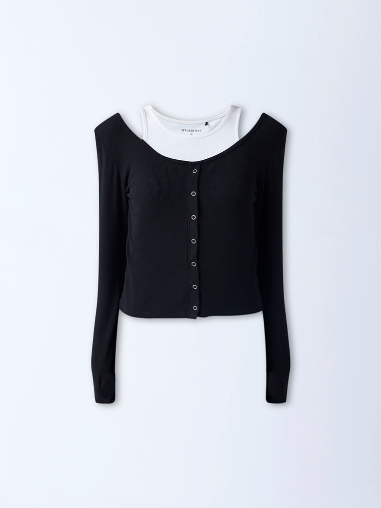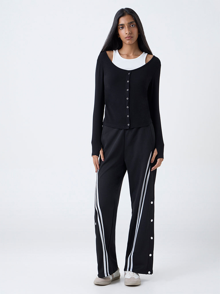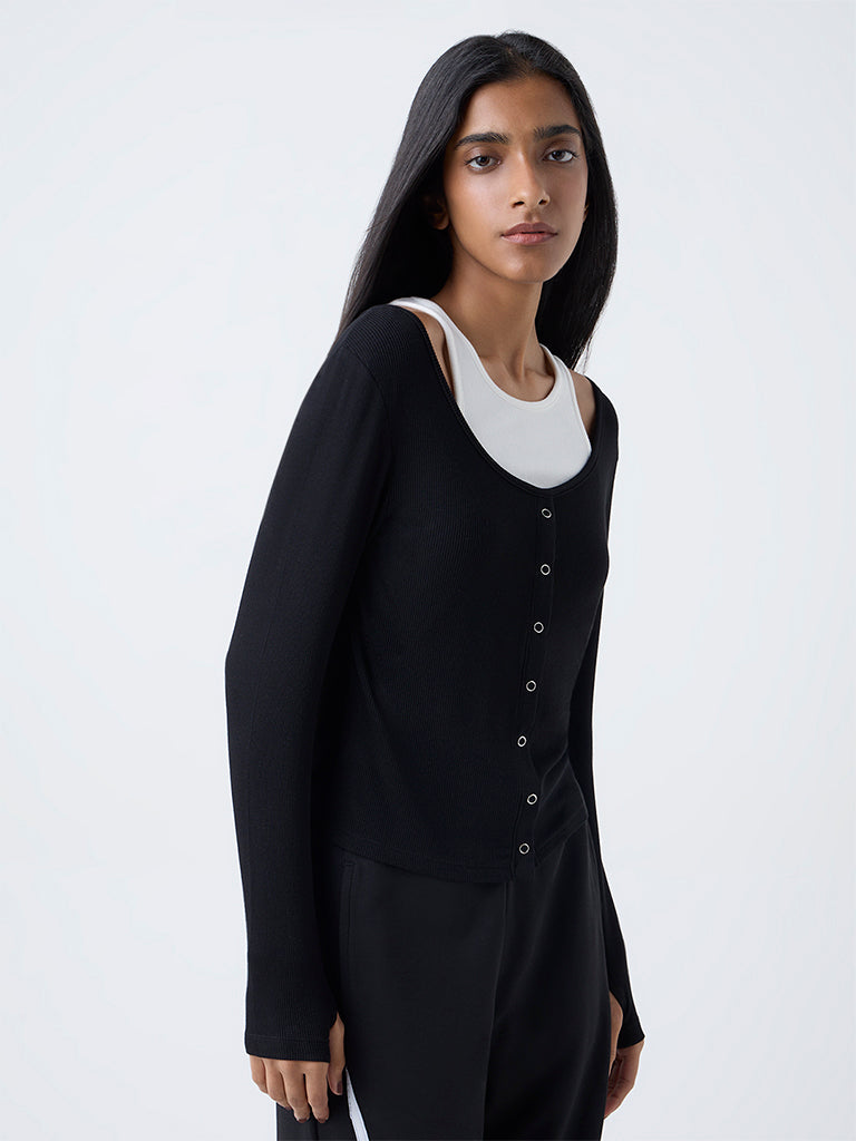 Enhance your athleisure edit with this black ribbed top from Studiofit. Designed with a round neck. button-up front. and full sleeves layered over a white inner. it delivers easy sophistication with functional comfort.