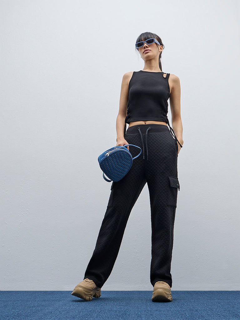 This sleeveless black top by Studiofit showcases a ruched design on the sides via drawstrings. It is crafted from an elasticated fabric with a round neckline and split shoulder straps.