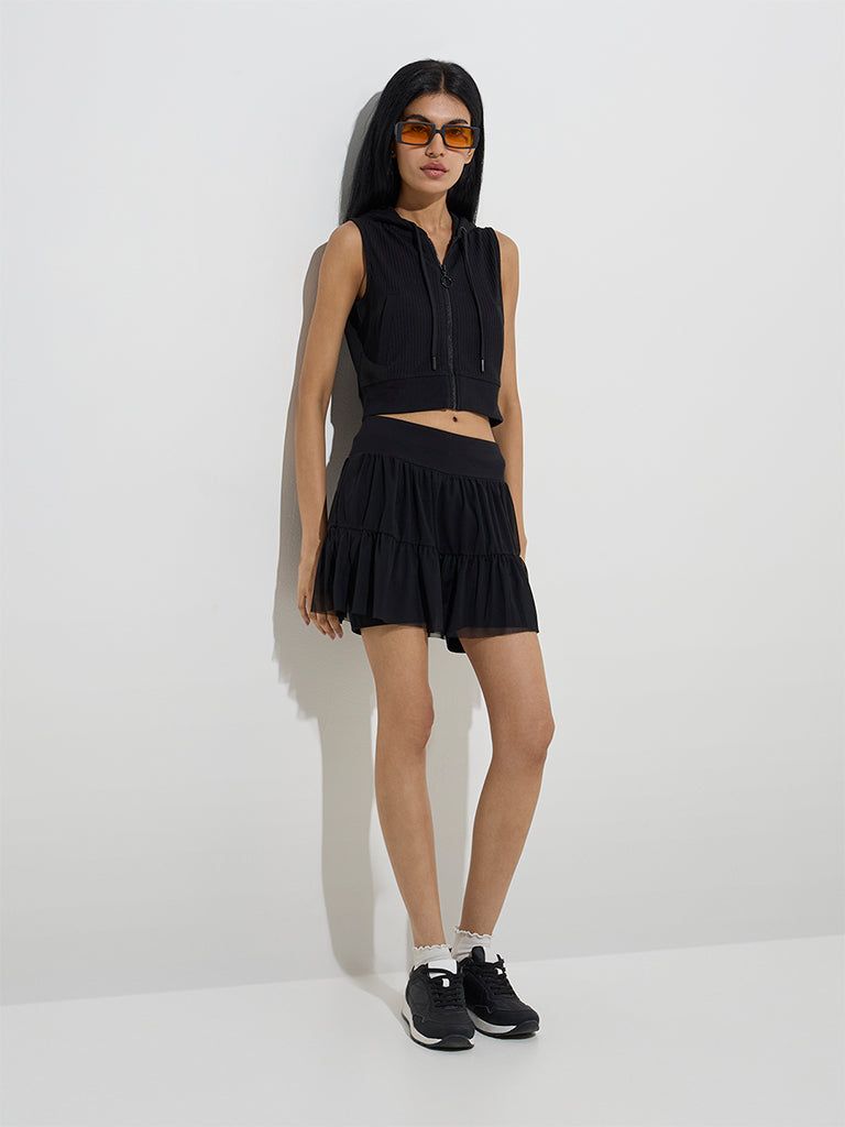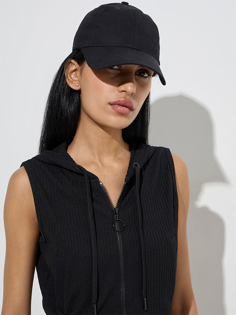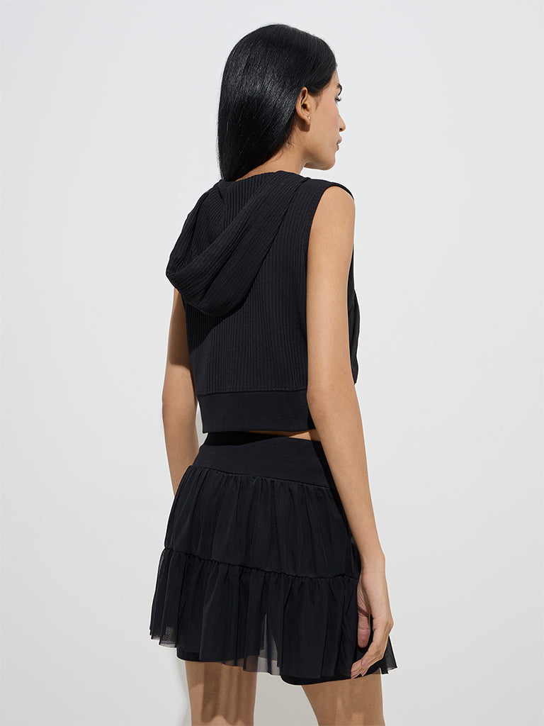 Stay stylish and comfortable with this black self-striped jacket from Studiofit. Crafted from quality fabric. it features a sleek sleeveless cut with an attached hoodie and adjustable drawstrings for a customizable fit. The zippered front and side pockets add functionality to its modern design. making it perfect for layering over casual outfits.