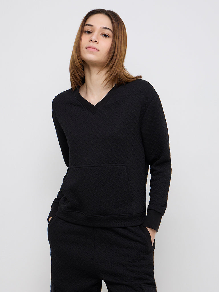 This black sweatshirt from Studiofit is crafted in a self-textured profile. Made from a lightweight fabric. it includes a V-neck and full sleeves. The kangaroo pockets adds a functional bonus.
