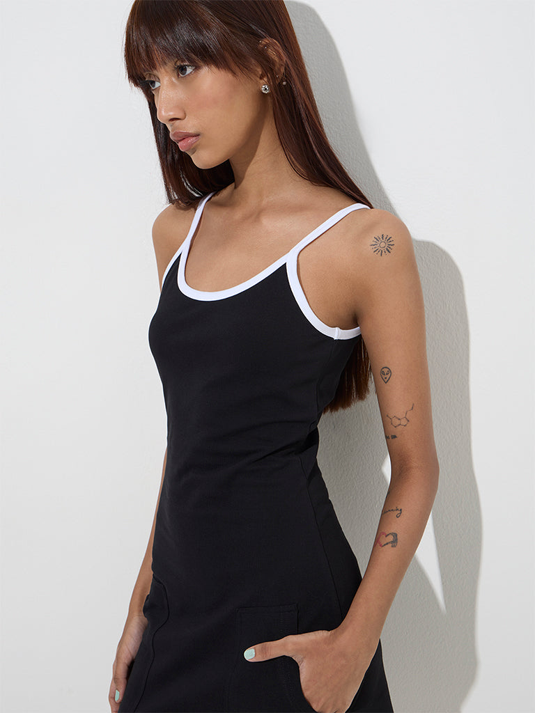 Spun from a cotton-rich fabric with a hint of stretch. this black a-line dress from Studiofit is designed for a sleek and flattering fit. Featuring a contrast white scoop neck and a sleeveless cut. it blends effortless style with all-day comfort.