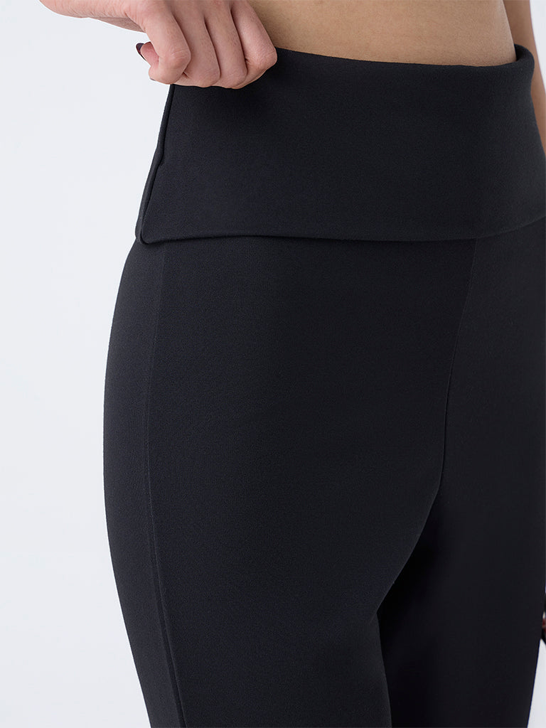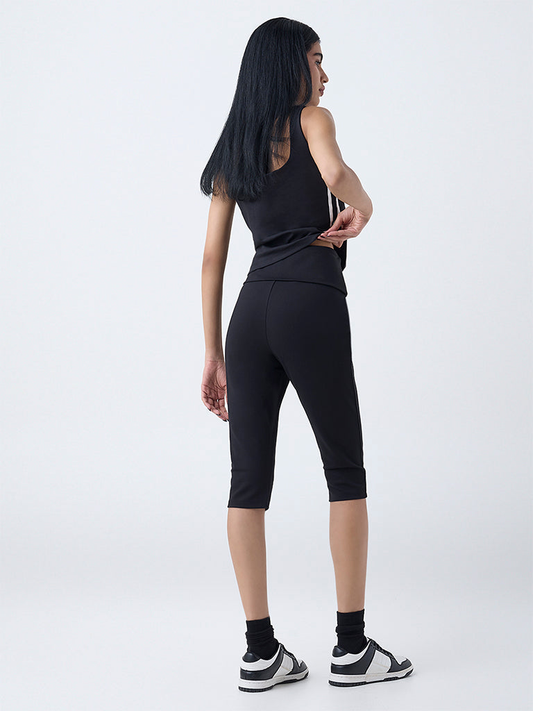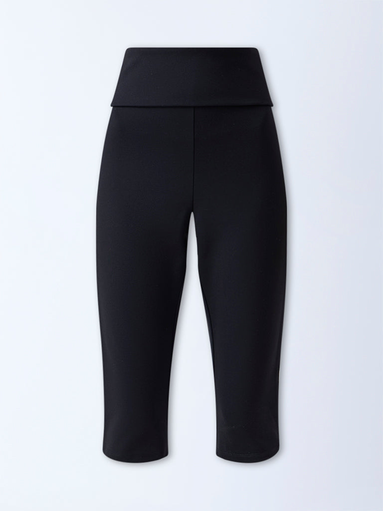 These black capri by Studiofit feature a smooth elastic waistband with upturned detailing for a sleek finish. Crafted from a soft. stretchable fabric. they offer a comfortable fit ideal for active and casual wear.
